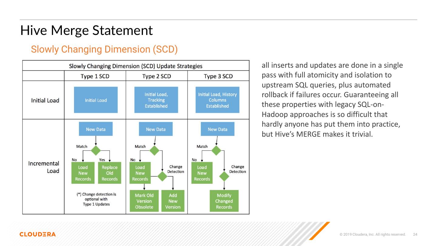 24 .Hive Merge Statement Slowly Changing Dimension (SCD) all inserts and updates are done in a single pass with full atomicity and isolation to upstream SQL queries, plus automated rollback if failures occur. Guaranteeing all these properties with legacy SQL-on- Hadoop approaches is so difficult that hardly anyone has put them into practice, but Hive’s MERGE makes it trivial. © 2019 Cloudera, Inc. All rights reserved. 24