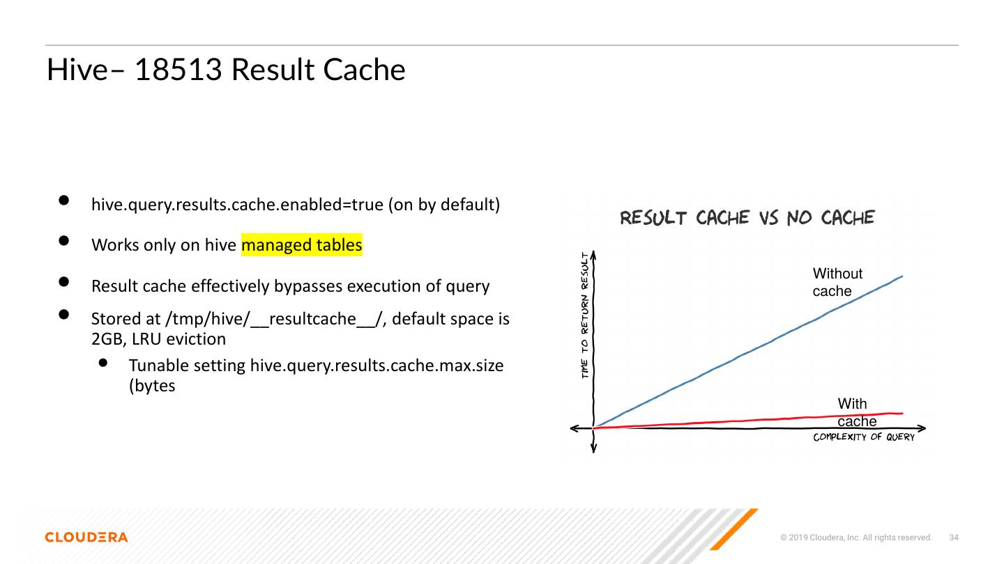 29 .Hive Materialized View Materialized View - Select A.a,B.b from A join B on A.c = B.c where A.a = 111 Select A.a,B.b from A join B on A.c = B.c where A.a = 111 Select A.a,B.b from mv SQL Check MV SQL Rewrite where A.a = 111 Create Materialized View mv As Select A.a,B.b from A join B on A.c = B.c © 2019 Cloudera, Inc. All rights reserved. 29