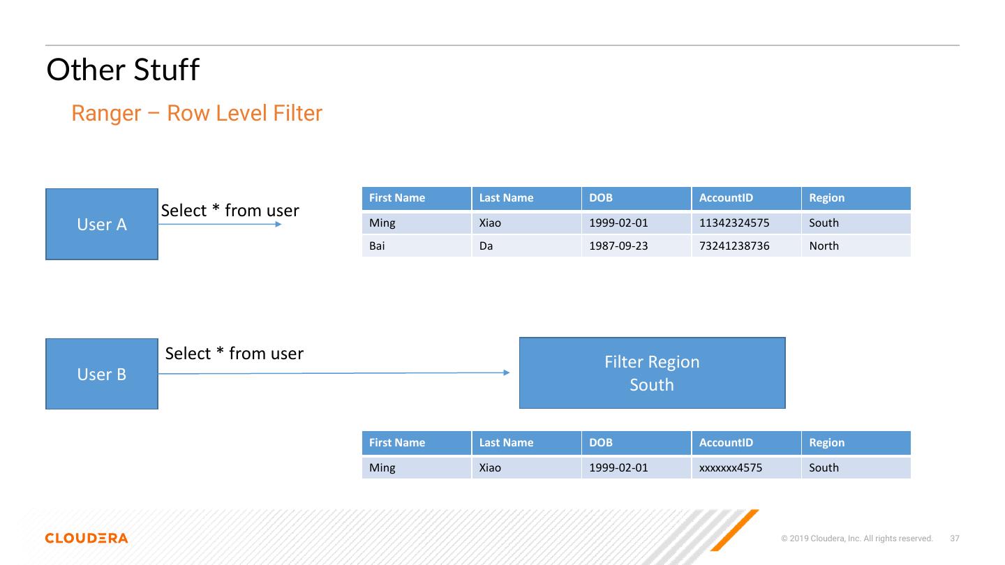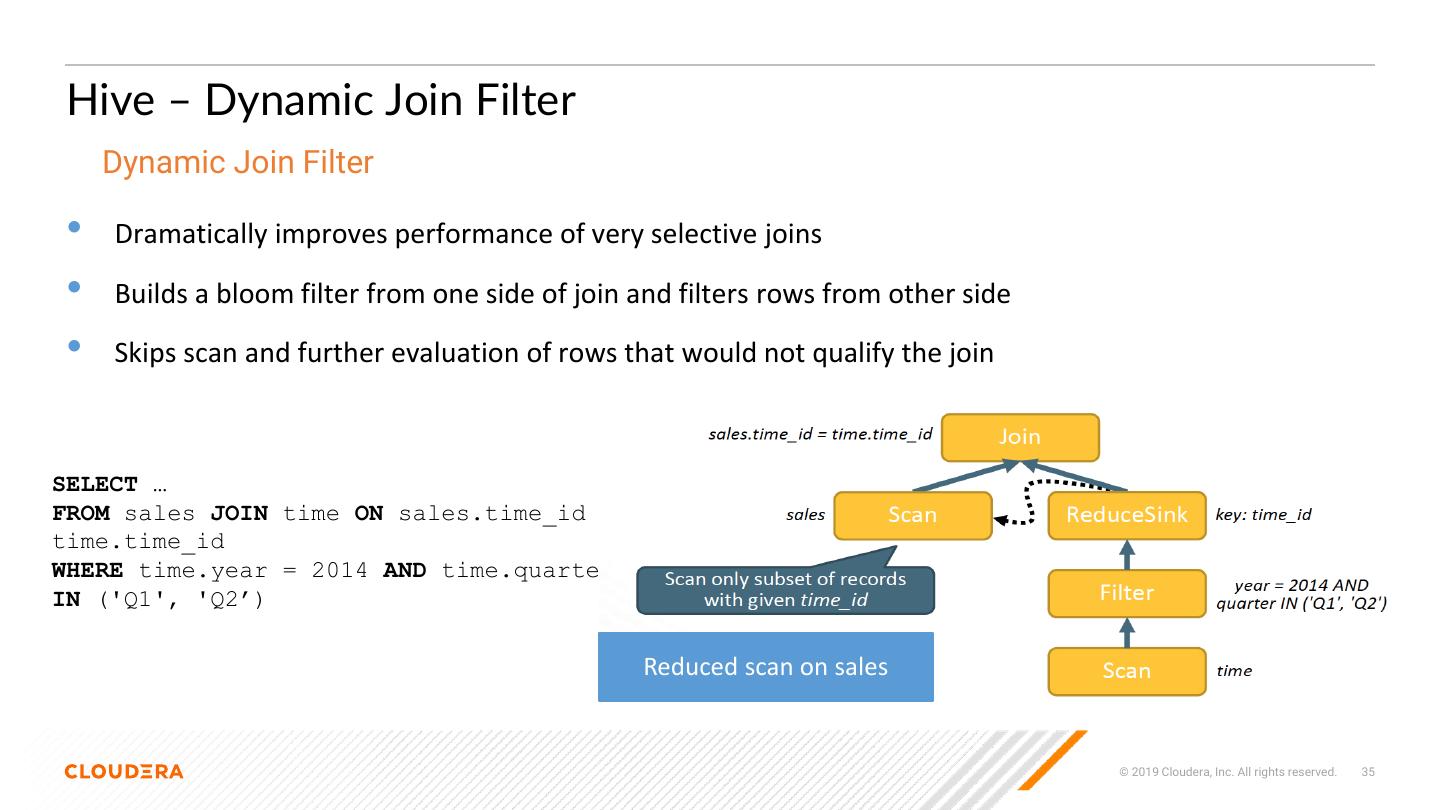 28 .Hive Materialized View Views – Hive-1143 Select A.a,B.b from A join B on A.c = B.c where A.a = 111 Select A.a,B.b from V where A.a = 111 Select C.a,C.b from SQL View SQL Rewrite (select A.a, B.b from A join B on A.c = B.c) C where C.a = 111 Create View As Select A.a,B.b from A join B on A.c = B.c © 2019 Cloudera, Inc. All rights reserved. 28