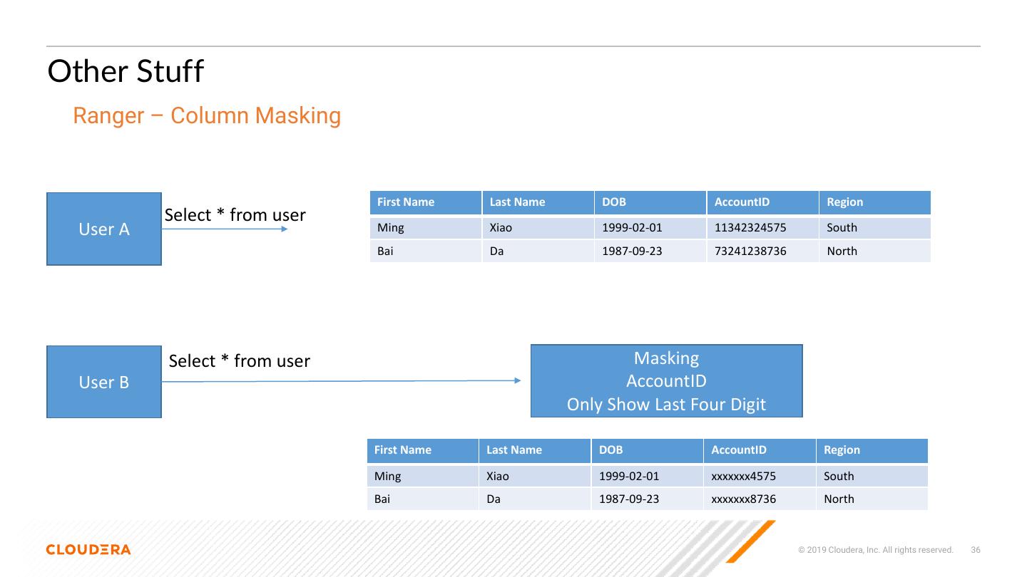 20 .Hive 1010 – Information schema & sysdb SYS database Find which tables have a column with ‘ssn’ as part of the column name? SELECT tbl_name, total_size FROM table_stats_view v, tbls t WHERE t.tbl_id = v.tbl_id ORDER BY cast(v.total_size as int) DESC LIMIT 3; © 2019 Cloudera, Inc. All rights reserved. 20
