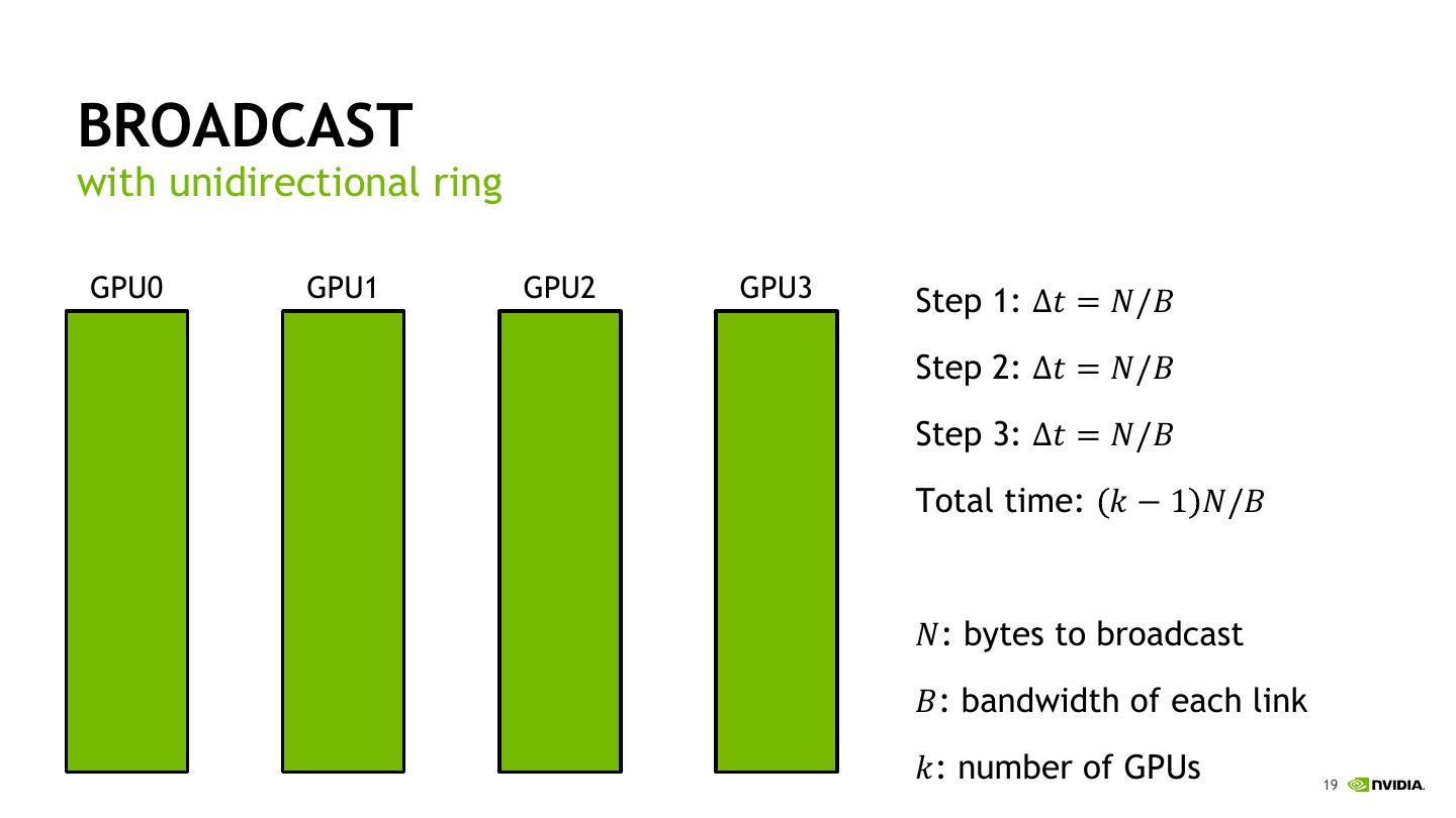 18 .BROADCAST with unidirectional ring GPU0 GPU1 GPU2 GPU3 Step 1: ∆𝑡 = 𝑁/𝐵 Step 2: ∆𝑡 = 𝑁/𝐵 Step 3: ∆𝑡 = 𝑁/𝐵 𝑁: bytes to broadcast 𝐵: bandwidth of each link 18