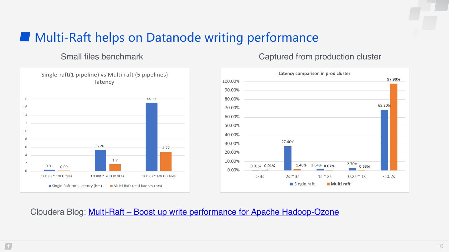 10 . Multi-Raft helps on Datanode writing performance Small files benchmark Captured from production cluster Single-raft(1 pipeline) vs Multi-raft (5 pipelines) Latency comparison in prod cluster 97.90% latency 100.00% 90.00% 18 >> 17 80.00% 16 68.20% 70.00% 14 60.00% 12 50.00% 10 40.00% 8 30.00% 27.40% 6 5.26 4.77 4 20.00% 2 1.7 10.00% 2.70% 0.31 0.09 0.01% 0.01% 1.46% 1.64% 0.07% 0.53% 0 0.00% 100KB * 1000 files 100KB * 20000 fil es 100KB * 60000 fil es > 3s 2s ~ 3s 1s ~ 2s 0.2s ~ 1s < 0.2s Single Raft tot al latency (hrs) Mult i Raft total latency (hrs) Single raft Multi raft Cloudera Blog: Multi-Raft – Boost up write performance for Apache Hadoop-Ozone 10