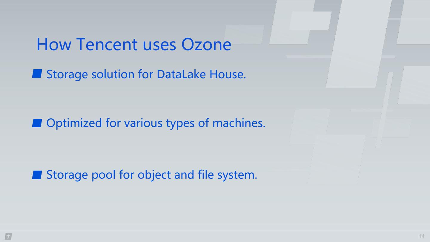 14 .How Tencent uses Ozone Storage solution for DataLake House. Optimized for various types of machines. Storage pool for object and file system. 14