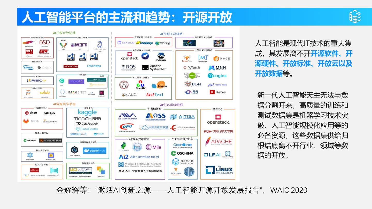 3 .人工智能平台的主流和趋势:开源开放 人工智能是现代IT技术的重大集 成,其发展离不开开源软件、开 源硬件、开放标准、开放云以及 开放数据等。 新一代人工智能天生无法与数 据分割开来,高质量的训练和 测试数据集是机器学习技术突 破、人工智能规模化应用等的 必备资源,这些数据集供给归 根结底离不开行业、领域等数 据的开放。 金耀辉等:“激活AI创新之源——人工智能开源开放发展报告”,WAIC 2020