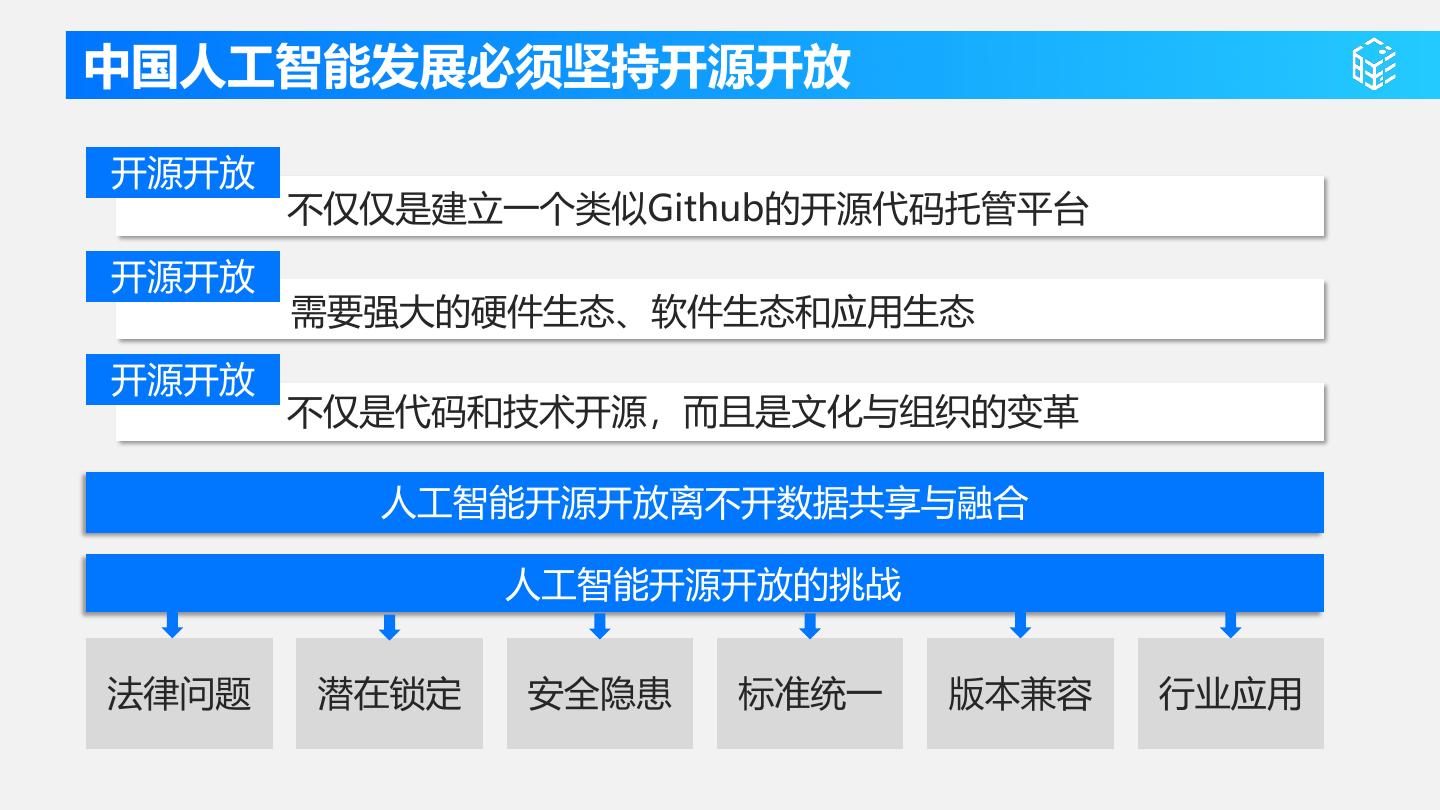 4 .中国人工智能发展必须坚持开源开放 开源开放 不仅仅是建立一个类似Github的开源代码托管平台 开源开放 需要强大的硬件生态、软件生态和应用生态 开源开放 不仅是代码和技术开源,而且是文化与组织的变革 人工智能开源开放离不开数据共享与融合 人工智能开源开放的挑战 法律问题 潜在锁定 安全隐患 标准统一 版本兼容 行业应用
