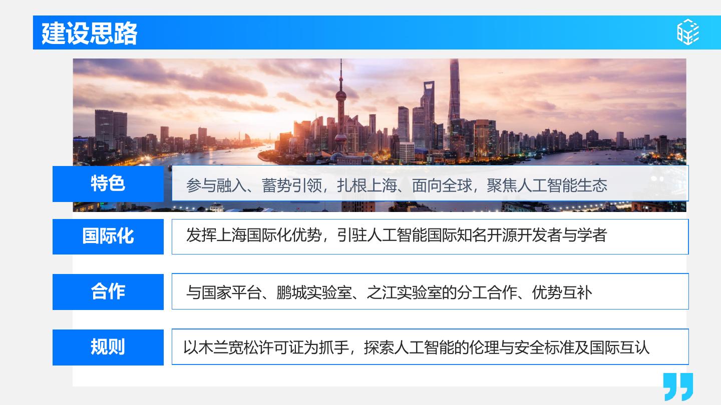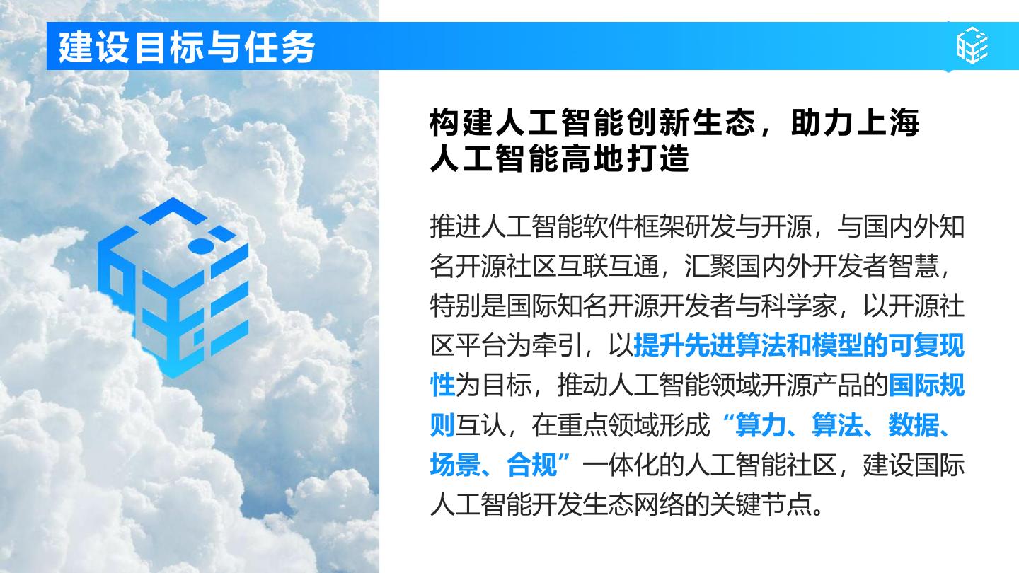 构建人工智能创新生态,助力上海人工智能高地打造,推进人工智能软件框架研发与开源,与国内外知名开源社区互联互通,汇聚国内外开发者智慧 特别是国际知名开源开发者与科学家,以开源社区平台为牵引,以提升先进算法和模型的可复现性为目标,推动人工智能领域开源产品的国际规则互认,在重点领域形成“算力、算法、数据、 场景、合规”一体化的人工智能社区,建设国际人工智能开发生态网络的关键节点。