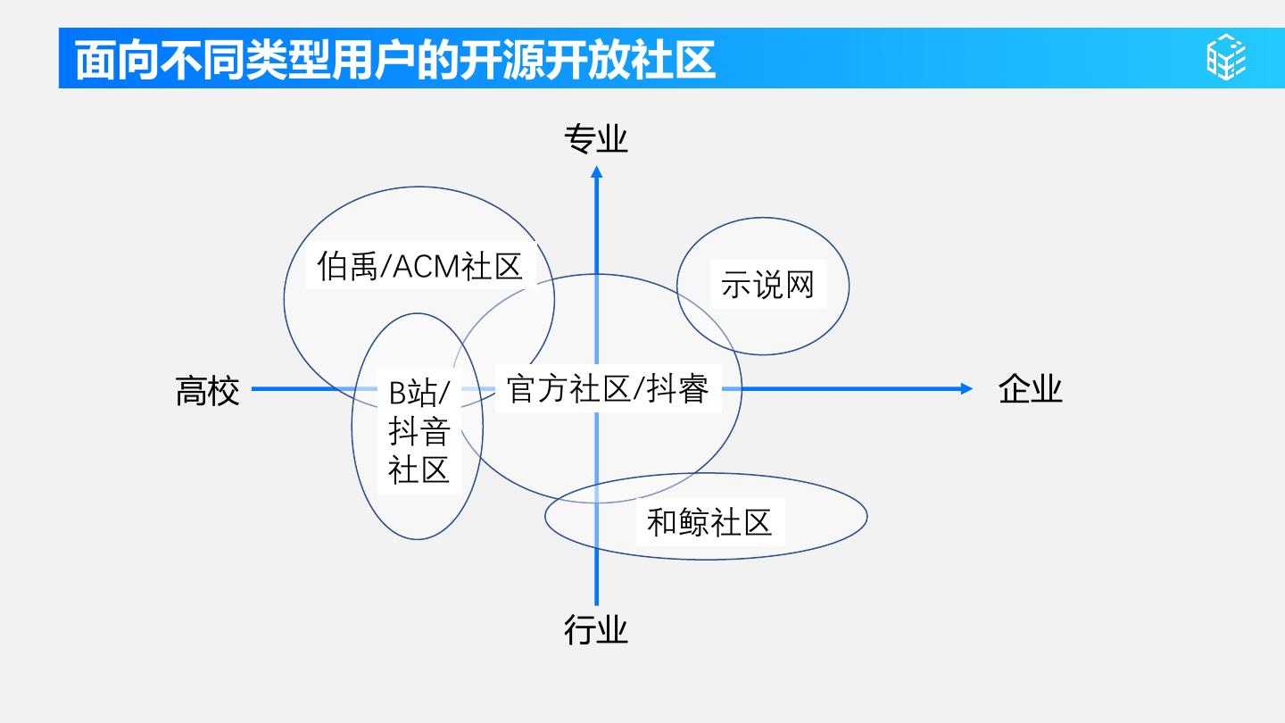 13 .面向不同类型用户的开源开放社区 专业 伯禹/ACM社区 示说网 高校 B站/ 官方社区/抖睿 企业 抖音 社区 和鲸社区 行业