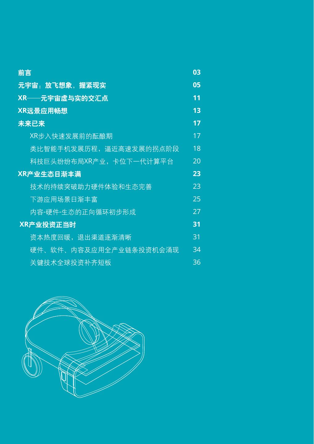 2 .全球XR产业洞察 | XR产业投资正当时 前言 03 元宇宙:放飞想象,握紧现实 05 XR——元宇宙虚与实的交汇点 11 XR远景应用畅想 13 未来已来 17 XR步入快速发展前的酝酿期 17 类比智能手机发展历程,逼近高速发展的拐点阶段 18 科技巨头纷纷布局XR产业,卡位下一代计算平台 20 XR产业生态日渐丰满 23 技术的持续突破助力硬件体验和生态完善 23 下游应用场景日渐丰富 25 内容-硬件-生态的正向循环初步形成 27 XR产业投资正当时 31 资本热度回暖,退出渠道逐渐清晰 31 硬件、软件、内容及应用全产业链条投资机会涌现 34 关键技术全球投资补齐短板 36 02