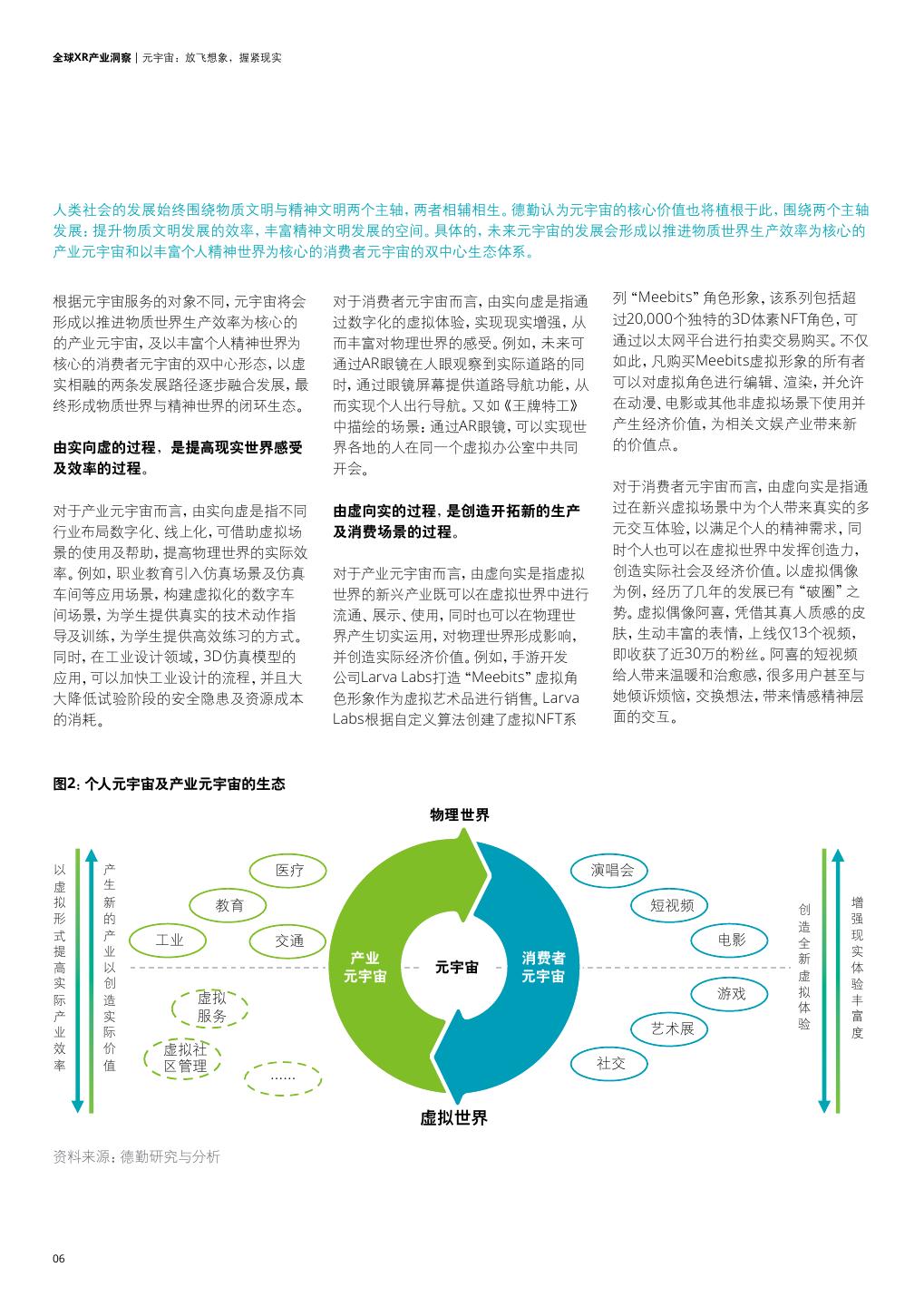 6 .全球XR产业洞察 | 元宇宙:放飞想象,握紧现实 人类社会的发展始终围绕物质文明与精神文明两个主轴,两者相辅相生。德勤认为元宇宙的核心价值也将植根于此,围绕两个主轴 发展:提升物质文明发展的效率,丰富精神文明发展的空间。具体的,未来元宇宙的发展会形成以推进物质世界生产效率为核心的 产业元宇宙和以丰富个人精神世界为核心的消费者元宇宙的双中心生态体系。 根据元宇宙服务的对象不同,元宇宙将会 对于消费者元宇宙而言,由实向虚是指通 列“Meebits”角色形象,该系列包括超 形成以推进物质世界生产效率为核心的 过数字化的虚拟体验,实现现实增强,从 过20,000个独特的3D体素NFT角色,可 的产业元宇宙,及以丰富个人精神世界为 而丰富对物理世界的感受。例如,未来可 通过以太网平台进行拍卖交易购买。不仅 核心的消费者元宇宙的双中心形态,以虚 通过AR眼镜在人眼观察到实际道路的同 如此,凡购买Meebits虚拟形象的所有者 实相融的两条发展路径逐步融合发展,最 时,通过眼镜屏幕提供道路导航功能,从 可以对虚拟角色进行编辑、渲染,并允许 终形成物质世界与精神世界的闭环生态。 而实现个人出行导航。又如《王牌特工》 在动漫、电影或其他非虚拟场景下使用并 中描绘的场景:通过AR眼镜,可以实现世 产生经济价值,为相关文娱产业带来新 由实向虚的过程,是提高现实世界感受 界各地的人在同一个虚拟办公室中共同 的价值点。 及效率的过程。 开会。 对于消费者元宇宙而言,由虚向实是指通 对于产业元宇宙而言,由实向虚是指不同 由虚向实的过程,是创造开拓新的生产 过在新兴虚拟场景中为个人带来真实的多 行业布局数字化、线上化,可借助虚拟场 及消费场景的过程。 元交互体验,以满足个人的精神需求,同 景的使用及帮助,提高物理世界的实际效 时个人也可以在虚拟世界中发挥创造力, 率。例如,职业教育引入仿真场景及仿真 对于产业元宇宙而言,由虚向实是指虚拟 创造实际社会及经济价值。以虚拟偶像 车间等应用场景,构建虚拟化的数字车 世界的新兴产业既可以在虚拟世界中进行 为例,经历了几年的发展已有“破圈”之 间场景,为学生提供真实的技术动作指 流通、展示、使用,同时也可以在物理世 势。虚拟偶像阿喜,凭借其真人质感的皮 导及训练,为学生提供高效练习的方式。 界产生切实运用,对物理世界形成影响, 肤,生动丰富的表情,上线仅13个视频, 同时,在工业设计领域,3D仿真模型的 并创造实际经济价值。例如,手游开发 即收获了近30万的粉丝。阿喜的短视频 应用,可以加快工业设计的流程,并且大 公司Larva Labs打造“Meebits”虚拟角 给人带来温暖和治愈感,很多用户甚至与 大降低试验阶段的安全隐患及资源成本 色形象作为虚拟艺术品进行销售。Larva 她倾诉烦恼,交换想法,带来情感精神层 的消耗。 Labs根据自定义算法创建了虚拟NFT系 面的交互。 Open sans Open sans 图2:个人元宇宙及产业元宇宙的生态 物理世界 以 产 医疗 演唱会 虚 生 拟 新 教育 短视频 增 创 形 的 强 造 式 产 工业 电影 现 交通 全 提 业 实 产业 消费者 新 高 以 元宇宙 体 实 创 元宇宙 元宇宙 虚 验 游戏 拟 际 造 虚拟 丰 体 产 实 服务 验 富 业 际 艺术展 度 效 价 虚拟社 率 值 区管理 社交 …… 虚拟世界 资料来源:德勤研究与分析 06