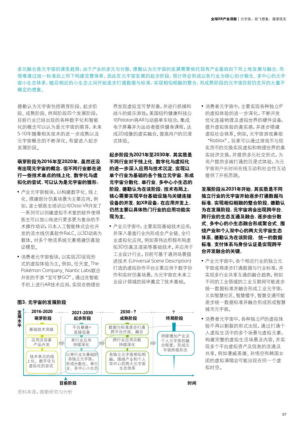 7 . 全球XR产业洞察 | 元宇宙:放飞想象,握紧现实 多元融合是元宇宙的演变趋势:由于产业的多元与分散,德勤认为元宇宙的发展需要依托现有产业基础自下而上地发展与融合,而 很难通过统一标准自上而下构建完整体系。因此在元宇宙发展的起步阶段,预计将会形成以各行业为核心的分散化、多中心的元宇 宙小生态体系,随后相近的小生态之间开始逐步打通数据与标准,实现相似相融的整合,而成熟阶段的元宇宙目前仍充斥的大量不 确定的想象。 德勤认为元宇宙包括萌芽阶段、起步阶 界发现虚拟宝可梦形象,并进行抓捕和 • 消费者元宇宙中,主要实现各种独立IP 段、成熟阶段、终局阶段四个发展阶段, 战斗的娱乐游戏;美国纽约健康科技公 的虚拟体验的进一步深化,不断开发 目前行业已经出现的各种数字化和智能 司Peloton将AR与动感单车结合,集成 优化连接物理及虚拟世界的硬件设备, 化的概念可以认为是元宇宙的萌芽,未来 电子屏幕并为运动者提供健身课程,达 提升虚拟体验的真实感,并逐步搭建 5-10年随着相关技术的进一步成熟以及 成2D成像的虚实融合,提高用户的沉浸 虚拟社会体系。例如,元宇宙游戏鼻祖 元宇宙概念的不断深化,有望进入起步 式体验。 “Roblox”,玩家可以通过游戏币与现 发展阶段。 实货币的兑换实现虚拟和物理世界的真 起步阶段为2021年至2030年,其实质是 实经济交换,并提供多元社交形式,为 萌芽阶段为2016年至2020年,虽然还没 不同行业对于线上化、数字化与虚拟化 用户提供多端打通的沉浸式体验,为元 有出现元宇宙的概念,但不同行业都在进 的进一步深入应用与技术沉淀,实现以 宇宙用户长时间在线互动和社会性互动 行一些技术单点的线上化、数字化与虚 单个行业为基础的各个独立元宇宙,形成 提供了开拓思路。 拟化的尝试,可以认为是元宇宙的雏形: 元宇宙分散化、单行业、多中心小生态的 阶段。德勤认为在该阶段:技术布局上, 发展阶段从2031年开始,其实质是不同 • 产业元宇宙板块,以构建数字化、线上 核心需要实现平台基础设施与关键连接 独立行业的元宇宙开始逐步打通数据与 化、搭建部分仿真场景为主要应用。例 设备的开发,如XR设备;在应用开发上, 标准,实现相似相融的整合阶段。德勤认 如,波士顿医生培训公司Osso VR开发了 仍然主要以具体热门行业的应用功能实 为在发展阶段,元宇宙将会出现跨平台、 一系列可以创建虚拟手术室的软件使得 现为主。 跨行业的生态互通及融合,逐步由分散 医生可以放心地进行更多更为复杂的手 式、多中心的小生态融合形成聚合式、围 术操作培训;日本人工智能株式会社开 • 产业元宇宙中,主要实现基础技术应用, 绕产业和个人双中心的两大元宇宙生态 发的流水线仿真软件RaLC,以3D动画为 并深入垂直行业内形成全产业链、全行 体系。德勤认为在该阶段, 统一的数据 载体,对多个物流系统元素搭建仿真验 业虚拟化应用。例如英伟达积极布局虚 标准、支付体系与身份认证是实现跨平 证模型。 拟3D仿真及渲染等基础技术,并应用于 台开发融合的关键。 工业设计行业。目前可基于通用场景描 • 消费者元宇宙板块,以实现2D呈现形 述技术(Universal Scene Description) • 产业元宇宙中,各个相近行业的独立元 式的虚拟体验为主。例如,任天堂、The 打造的虚拟协作平台主要应用于数字协 宇宙或将逐步打通数据与行业标准,并 Pokémon Company、Niantic Labs联合 作和实时仿真场景,为元宇宙在未来工 实现多行业共享互通的融合趋势。例如 开发的手游“宝可梦GO”,通过在智能 业设计领域的延申奠定了技术基础。 不同的工业领域的工业互联网可能逐步 手机上进行AR技术应用,实现在物理世 统一数据标准并融合形成工业元宇宙, 又如智慧社区、智慧楼宇、智慧交通可能 图3:元宇宙的发展阶段 逐步统一数据标准并融合形成形成智慧 发展水平 2016-2020 城市元宇宙。 2021-2030 2030 - ? ? 萌芽阶段 起步阶段 成熟阶段 终局阶段 • 消费者元宇宙中,各种独立IP的虚拟体 平台基建+ 数据与标准逐步打通 验不再以割裂的形式出现,通过打通个 基础技术突破 连接设备 跨平台开放、融合 人虚拟生活中的多个场景与虚拟元素, 持续增加产业及 应用及设备 单行业应用 跨行业应用功能 个人元宇宙的融 构建完整的虚拟生活场景及内容,并实 产品开发 持续深化 持续深化 合程度,形成元 现多个平台虚拟资产及信息的流通及 宇宙终极形态 以单行业为基础的 各独立元宇宙相似相 共享,例如漫威英雄、孙悟空和韩国女 技术单点的线 各独立元宇宙, 融,围绕产业和个人 团的虚拟演唱会可能出现在同一个虚 上化、数字化与 形成分散化、单行 双中心的两大元宇宙 虚拟化的尝试 拟时空。 业、多中心小生态 生态体系 目前阶段 时间 资料来源:德勤研究与分析 07