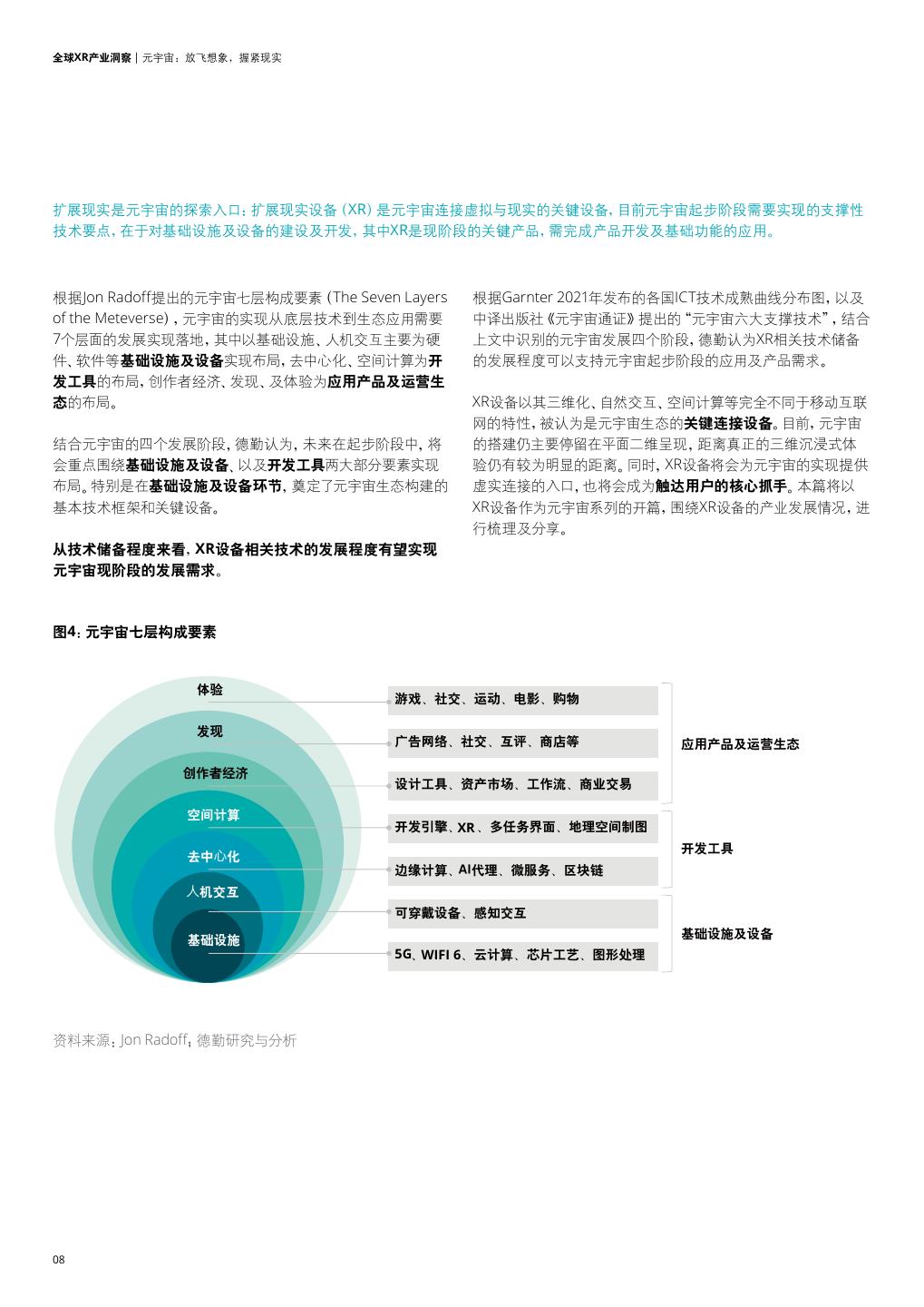 8 .全球XR产业洞察 | 元宇宙:放飞想象,握紧现实 扩展现实是元宇宙的探索入口:扩展现实设备(XR)是元宇宙连接虚拟与现实的关键设备,目前元宇宙起步阶段需要实现的支撑性 技术要点,在于对基础设施及设备的建设及开发,其中XR是现阶段的关键产品,需完成产品开发及基础功能的应用。 根据Jon Radoff提出的元宇宙七层构成要素(The Seven Layers 根据Garnter 2021年发布的各国ICT技术成熟曲线分布图,以及 of the Meteverse),元宇宙的实现从底层技术到生态应用需要 中译出版社《元宇宙通证》提出的“元宇宙六大支撑技术”,结合 7个层面的发展实现落地,其中以基础设施、人机交互主要为硬 上文中识别的元宇宙发展四个阶段,德勤认为XR相关技术储备 件、软件等基础设施及设备实现布局,去中心化、空间计算为开 的发展程度可以支持元宇宙起步阶段的应用及产品需求。 发工具的布局,创作者经济、发现、及体验为应用产品及运营生 态的布局。 XR设备以其三维化、自然交互、空间计算等完全不同于移动互联 网的特性,被认为是元宇宙生态的关键连接设备。目前,元宇宙 结合元宇宙的四个发展阶段,德勤认为,未来在起步阶段中,将 的搭建仍主要停留在平面二维呈现,距离真正的三维沉浸式体 会重点围绕基础设施及设备、以及开发工具两大部分要素实现 验仍有较为明显的距离。同时,XR设备将会为元宇宙的实现提供 布局。特别是在基础设施及设备环节,奠定了元宇宙生态构建的 虚实连接的入口,也将会成为触达用户的核心抓手。本篇将以 基本技术框架和关键设备。 XR设备作为元宇宙系列的开篇,围绕XR设备的产业发展情况,进 行梳理及分享。 从技术储备程度来看,XR设备相关技术的发展程度有望实现 元宇宙现阶段的发展需求。 Open sans Open sans 图4:元宇宙七层构成要素 体验 游戏、社交、运动、电影、购物 发现 广告网络、社交、互评、商店等 应用产品及运营生态 创作者经济 设计工具、资产市场、工作流、商业交易 空间计算 开发引擎、XR 、多任务界面、地理空间制图 开发工具 去中心化 边缘计算、AI代理、微服务、区块链 人机交互 可穿戴设备、感知交互 基础设施 基础设施及设备 5G、WIFI 6、云计算、芯片工艺、图形处理 资料来源:Jon Radoff;德勤研究与分析 08