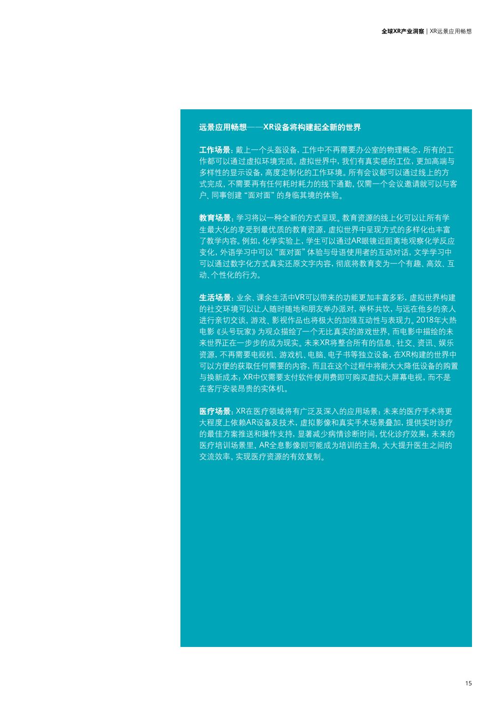 15 . 全球XR产业洞察 | XR远景应用畅想 远景应用畅想——XR设备将构建起全新的世界 工作场景:戴上一个头盔设备,工作中不再需要办公室的物理概念,所有的工 作都可以通过虚拟环境完成。虚拟世界中,我们有真实感的工位,更加高端与 多样性的显示设备,高度定制化的工作环境。所有会议都可以通过线上的方 式完成,不需要再有任何耗时耗力的线下通勤,仅需一个会议邀请就可以与客 户、同事创建“面对面”的身临其境的体验。 教育场景:学习将以一种全新的方式呈现。教育资源的线上化可以让所有学 生最大化的享受到最优质的教育资源,虚拟世界中呈现方式的多样化也丰富 了教学内容。例如,化学实验上,学生可以通过AR眼镜近距离地观察化学反应 变化,外语学习中可以“面对面”体验与母语使用者的互动对话,文学学习中 可以通过数字化方式真实还原文字内容,彻底将教育变为一个有趣、高效、互 动、个性化的行为。 生活场景:业余、课余生活中VR可以带来的功能更加丰富多彩,虚拟世界构建 的社交环境可以让人随时随地和朋友举办派对,举杯共饮,与远在他乡的亲人 进行亲切交谈,游戏、影视作品也将极大的加强互动性与表现力。2018年大热 电影《头号玩家》为观众描绘了一个无比真实的游戏世界,而电影中描绘的未 来世界正在一步步的成为现实。未来XR将整合所有的信息、社交、资讯、娱乐 资源,不再需要电视机、游戏机、电脑、电子书等独立设备,在XR构建的世界中 可以方便的获取任何需要的内容,而且在这个过程中将能大大降低设备的购置 与换新成本:XR中仅需要支付软件使用费即可购买虚拟大屏幕电视,而不是 在客厅安装昂贵的实体机。 医疗场景:XR在医疗领域将有广泛及深入的应用场景:未来的医疗手术将更 大程度上依赖AR设备及技术,虚拟影像和真实手术场景叠加,提供实时诊疗 的最佳方案推送和操作支持,显著减少病情诊断时间,优化诊疗效果;未来的 医疗培训场景里,AR全息影像则可能成为培训的主角,大大提升医生之间的 交流效率,实现医疗资源的有效复制。 15