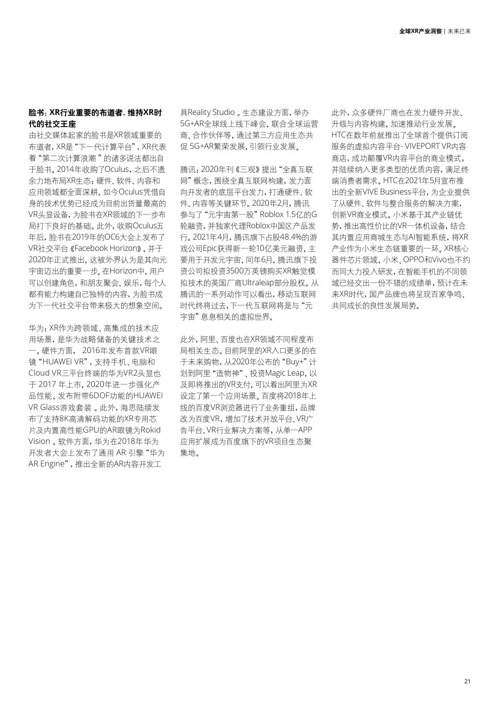 21 . 全球XR产业洞察 | 未来已来 脸书:XR行业重要的布道者,维持XR时 具Reality Studio 。生态建设方面,举办 此外,众多硬件厂商也在发力硬件开发、 代的社交王座 5G+AR全球线上线下峰会,联合全球运营 升级与内容构建,加速推动行业发展。 由社交媒体起家的脸书是XR领域重要的 商、合作伙伴等,通过第三方应用生态共 HTC在数年前就推出了全球首个提供订阅 布道者,XR是“下一代计算平台”,XR代表 促 5G+AR繁荣发展,引领行业发展。 服务的虚拟内容平台- VIVEPORT VR内容 着“第二次计算浪潮 ”的诸多说法都出自 商店,成功颠覆VR内容平台的商业模式, 于脸书。2014年收购了Oculus,之后不遗 腾讯:2020年刊《三观》提出“全真互联 并陆续纳入更多类型的优质内容,满足终 余力地布局XR生态:硬件、软件、内容和 网”概念,围绕全真互联网构建,发力面 端消费者需求。HTC在2021年5月宣布推 应用领域都全面深耕。如今Oculus凭借自 向开发者的底层平台发力,打通硬件、软 出的全新VIVE Business平台,为企业提供 身的技术优势已经成为目前出货量最高的 件、内容等关键环节。2020年2月,腾讯 了从硬件、软件与整合服务的解决方案, VR头显设备,为脸书在XR领域的下一步布 参与了“元宇宙第一股”Roblox 1.5亿的G 创新VR商业模式。小米基于其产业链优 局打下良好的基础。此外,收购Oculus五 轮融资,并独家代理Roblox中国区产品发 势,推出高性价比的VR一体机设备,结合 年后,脸书在2019年的OC6大会上发布了 行。2021年4月,腾讯旗下占股48.4%的游 其内置应用商城生态与AI智能系统,将XR VR社交平台《Facebook Horizon》,并于 戏公司Epic获得新一轮10亿美元融资,主 产业作为小米生态链重要的一环。XR核心 2020年正式推出,这被外界认为是其向元 要用于开发元宇宙,同年6月,腾讯旗下投 器件芯片领域,小米、OPPO和Vivo也不约 宇宙迈出的重要一步。在Horizon中,用户 资公司拟投资3500万英镑购买XR触觉模 而同大力投入研发,在智能手机的不同领 可以创建角色,和朋友聚会、娱乐,每个人 拟技术的英国厂商Ultraleap部分股权。从 域已经交出一份不错的成绩单,预计在未 都有能力构建自己独特的内容,为脸书成 腾讯的一系列动作可以看出,移动互联网 来XR时代,国产品牌也将呈现百家争鸣、 为下一代社交平台带来极大的想象空间。 时代终将过去,下一代互联网将是与“元 共同成长的良性发展局势。 宇宙”息息相关的虚拟世界。 华为:XR作为跨领域、高集成的技术应 用场景,是华为战略储备的关键技术之 此外,阿里、百度也在XR领域不同程度布 一。硬件方面, 2016年发布首款VR眼 局相关生态。目前阿里的XR入口更多的在 镜“HUAWEI VR”,支持手机、电脑和 于未来购物,从2020年公布的“Buy+”计 Cloud VR三平台终端的华为VR2头显也 划到阿里“造物神”、投资Magic Leap,以 于 2017 年上市,2020年进一步强化产 及即将推出的VR支付,可以看出阿里为XR 品性能,发布附带6DOF功能的HUAWEI 设定了第一个应用场景。百度将2018年上 VR Glass游戏套装 。此外,海思陆续发 线的百度VR浏览器进行了业务重组,品牌 布了支持8K高清解码功能的XR专用芯 改为百度VR,增加了技术开放平台、VR广 片及内置高性能GPU的AR眼镜为Rokid 告平台、VR行业解决方案等,从单一APP Vision 。软件方面,华为在2018年华为 应用扩展成为百度旗下的VR项目生态聚 开发者大会上发布了通用 AR 引擎“华为 集地。 AR Engine”,推出全新的AR内容开发工 21