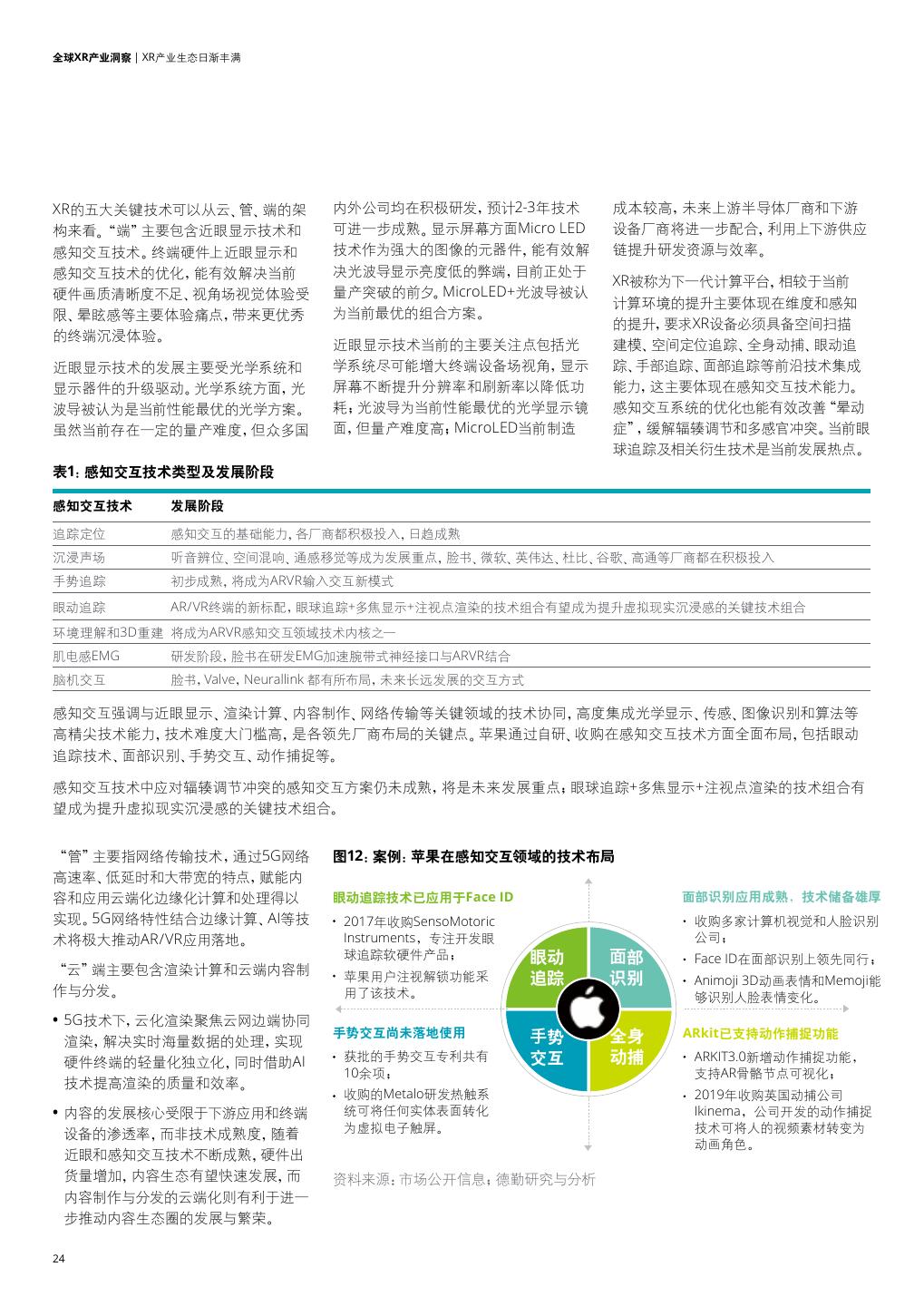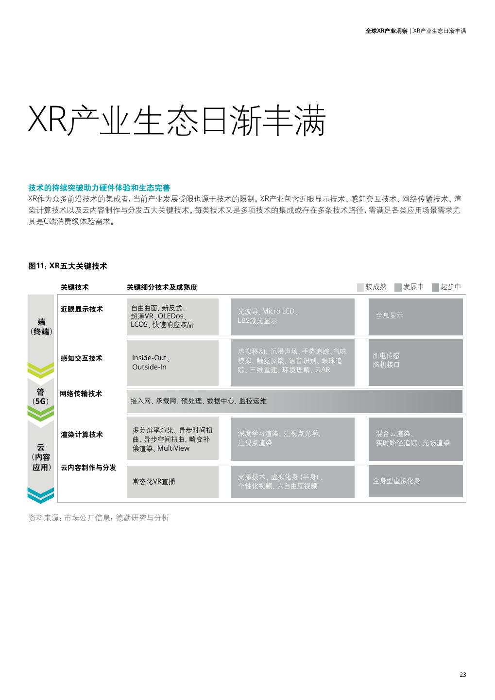 23 . 全球XR产业洞察 | XR产业生态日渐丰满 XR产业生态日渐丰满 技术的持续突破助力硬件体验和生态完善 XR作为众多前沿技术的集成者,当前产业发展受限也源于技术的限制。XR产业包含近眼显示技术、感知交互技术、网络传输技术、渲 染计算技术以及云内容制作与分发五大关键技术。每类技术又是多项技术的集成或存在多条技术路径,需满足各类应用场景需求尤 其是C端消费级体验需求。 图11:XR五大关键技术 关键技术 关键细分技术及成熟度 较成熟 发展中 起步中 近眼显示技术 自由曲面、新反式、 光波导、Micro LED、 超薄VR、OLEDos、 全息显示 端 LBS激光显示 LCOS、快速响应液晶 (终端) 虚拟移动、沉浸声场、手势追踪、气味 感知交互技术 Inside-Out、 肌电传感 模拟、触觉反馈、语音识别、眼球追 Outside-In 脑机接口 踪、三维重建、环境理解、云AR 管 网络传输技术 (5G) 接入网、承载网、预处理、数据中心、监控运维 多分辨率渲染、异步时间扭 深度学习渲染、注视点光学、 混合云渲染、 渲染计算技术 曲、异步空间扭曲、畸变补 注视点渲染 实时路径追踪、光场渲染 云 偿渲染、MultiView (内容 应用) 云内容制作与分发 支撑技术、虚拟化身(半身)、 常态化VR直播 全身型虚拟化身 个性化视频、六自由度视频 资料来源:市场公开信息;德勤研究与分析 23
