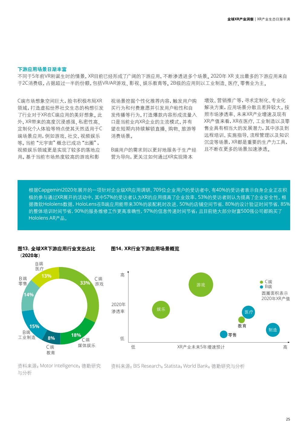 25 . 全球XR产业洞察 | XR产业生态日渐丰满 下游应用场景日渐丰富 不同于5年前VR刚诞生时的情景,XR目前已经形成了广阔的下游应用,不断渗透进多个场景。2020年 XR 支出最多的下游应用来自 于2C消费级,占据超过一半的份额,包括VR/AR游戏、影视、娱乐教育等。2B级的应用则以工业制造、医疗、零售业为主。 C端市场想象空间巨大,脸书积极布局XR 视场景挖掘个性化推荐内容,触发用户购 增效、营销推广等,寻求定制化、专业化 领域,打造虚拟世界社交生态的构想引发 买行为和付费意愿并引发用户粘性和自 解决方案,应用场景分散且差异较大。按 了行业对于XR在C端应用的美好想象。此 发传播等行为,打造爆款内容形成流量入 照市场渗透率、未来XR产业增速及现有 外,XR带来的高度沉浸感强、私密性高、 口是当前业内XR企业的主流模式,并有 XR产值来看,XR在医疗、工业制造以及零 定制化个人体验等特点使其天然适用于C 望在短期内持续解锁直播、购物、旅游等 售业具有相当大的发展潜力,其中涉及到 端场景应用,例如游戏、社交、视频娱乐 消费场景。 远程培训、实施指导、流程管理以及知识 等。当前“元宇宙”概念已成功“出圈”, 沉淀等场景,XR都是重要的生产力工具, 视频娱乐领域更是实现了较多的落地应 B端用户的需求则以更好地服务于生产经 且不断在更多的场景加速渗透。 用。基于当前市场热度较高的游戏和影 营为导向,更关注如何通过XR实现降本 根据Capgemini2020年展开的一项针对企业级XR应用调研,709位企业用户的受访者中,有40%的受访者表示自身企业正在积 极的参与通过XR展开的活动中,其中57%的受访者认为XR的应用提高了企业效率,53%的受访者则认为提高了企业安全性。根 据微软Hololens数据,HoloLens在B端应用能带来30%的装配耗时改进,50%的店铺空间节省,80%的设计验证时间节省,85% 的整体培训时间节省,90%的服务维修工作更高准确性,97%的信息传递时间节省;且目前绝大部分财富500强公司都购买了 Hololens AR产品。 图13:全球XR下游应用行业支出占比 Open sans Open sans 图14:XR行业下游应用场景概览 Open sans Open sans (2020年) B端 医疗 13% 高 B端 C端 零售 33% 游戏 C端 游戏 B端 14% 圆圈面积表示 2020年XR产值 2020年 渗透率 娱乐 医疗 15% 教育 制造 B端 18% 零售 工业制造 8% C端 低 C端 媒体娱乐 低 XR产业未来5年增速预计 高 教育 资料来源:Motor Intelligence;德勤研究 资料来源:BIS Research;Statista;World Bank;德勤研究与分析 与分析 25