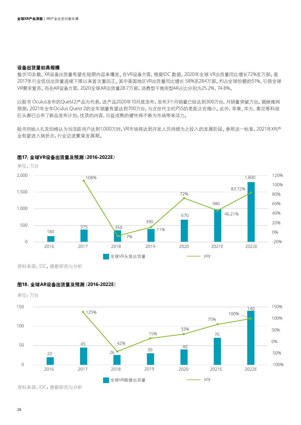 28 .全球XR产业洞察 | XR产业生态日渐丰满 设备出货量初具规模 蛰伏10余载,XR设备出货量有望在短期内迎来爆发。在VR设备方面,根据IDC 数据,2020年全球 VR出货量同比增长72%至万部,是 2017年行业低估出货量连续下降以来首次重回正。其中美国地区VR出货量同比增长 58%至284万部,约占全球份额的51%,引领全球 VR需求复苏。而在AR设备方面,2020全球AR出货量28.7万部,消费型于商用型AR占比分别为25.2%、74.8%。 以脸书 Oculus发布的Quest2产品为代表,该产品2020年10月底发布,发布3个月销量已经达到300万台,月销量突破万台。据映维网 预测,2021年全年Oculus Quest 2的全年销量有望达到700万台,与次世代主机PS5的差距正在缩小。此外,苹果、华为、索尼等科技 巨头都已公布了新品发布计划,优质的内容、日益成熟的硬件将不断为市场带来活力。 脸书创始人扎克伯格认为当活跃用户达到1,000万时,VR市场将达到开发人员持续为之投入的发展阶段。参照这一标准,2021年XR产 业有望进入转折点,行业迈进繁荣发展期。 Open sans Open sans 图17:全球VR设备出货量及预测(2016-2022E) 单位:万台 2,000 120% 108% 1,800 100% 83.72% 1,500 72% 80% 980 60% 1,000 46.21% 40% 670 390 20% 500 375 350 180 11% 0% - 7% 0 -20% 2016 2017 2018 2019 2020 2021E 2022E 全球VR头显出货量 yoy 资料来源:IDC;德勤研究与分析 Open sans 图18:全球AR设备出货量及预测(2016-2022E) Open sans 单位:万台 150 140 150% 125% 100% 75% 100% 100 33% 50% 15% 70 - 42% 0% 50 45 40 30 20 26 -50% 0 -100% 2016 2017 2018 2019 2020 2021E 2022E 全球VR眼镜出货量 yoy 资料来源:IDC;德勤研究与分析 28