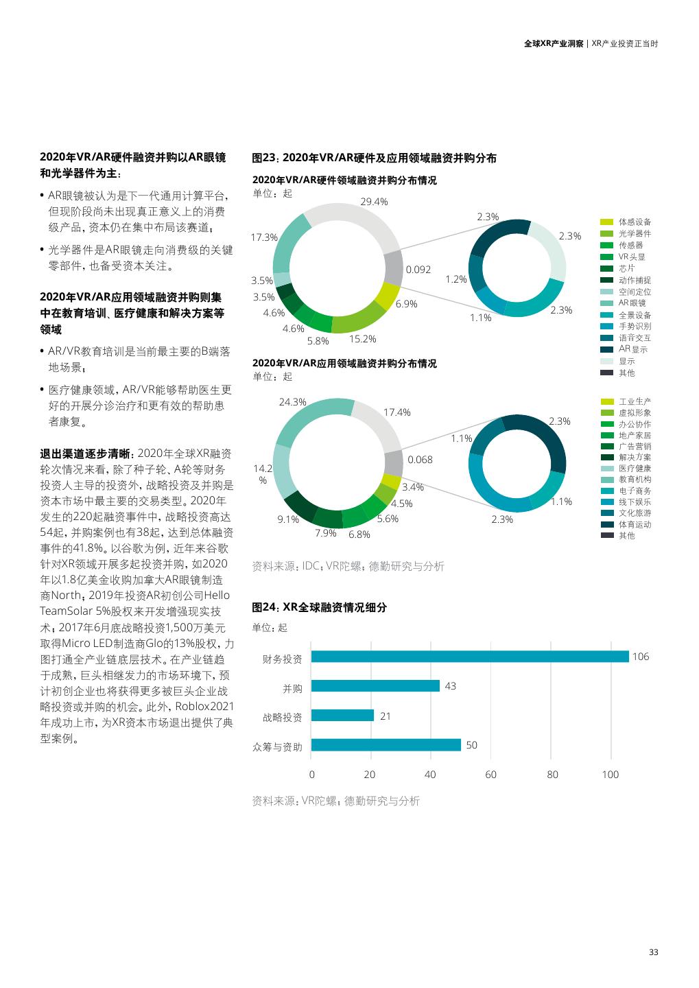11 . 全球XR产业洞察 | XR——元宇宙虚与实的交汇点 XR——元宇宙虚与实的交汇点 XR是指通过计算机将真实与虚拟相结合, 总体而言,AR技术成熟度稍落后于VR。一 动,VR、AR技术和应用也呈现融合互通趋 打造一个人机交互的虚拟环境, 方面,AR面临着与VR类似的发展难点,例 势,MR、XR等概念应运而生。从最终用户 是VR(Virtual Reality虚拟现实)、 如,真实感、虚拟场景绘制、传感设备和 感知看,VR、AR都是为用户的虚拟体验服 AR(Augmented Reality增强现实)、 交互设备的性能等;此外,AR还需解决虚 务。本报告将从市场需求与发展的角度探 MR(Mixed Reality混合现实)等多种技 拟物体和真实环境精确对准定位,将虚拟 讨XR市场的投资潜力与投资机会。 术的统称。 场景与真实环境融为一体的显示设备挑 战。目前市场已经推出了多款VR头显和眼 后文内容均采用更为广义的XR或虚拟现Open sans Op VR和AR是XR概念的主体,两者都带来虚 镜设备,一定程度获得了C端消费级市场 实描述,不对VR、AR、MR等概念进行明 拟世界的体验,但技术实现路径存在较 的认可;而AR眼镜方面,依然需要克服诸 确区分。 大差异:VR是利用设备模拟一个虚拟世 多技术障碍。 界,利用计算机生成一种模拟环境,强调 用户与虚拟世界的实时交互,带来封闭 当前应用市场看,VR设备占近一半的市场 式、沉浸式的虚拟世界体验;而AR则借助 份额,AR大约占三分之一,剩下市场则由 计算机图形技术和可视化技术产生真实 MR占据。 VR MR 世界中不存在的虚拟对象, 并将虚拟对象 XR 准确“放置”在真实世界中,使用户处于 随着5G技术及5G网络的发展赋能更 真实世界与虚拟世界的交融中,带来感知 多的应用场景,AI技术和计算视觉的融 AR 效果更丰富的环境体验。 合驱动,行业玩家的创新硬件功能驱 Open sans Open sans Open sans 图6:VR与AR的区别 图7:XR市场规模按技术应用占比(2020) VR AR 通过计算机技术产生的电子信号,将其 计算机基于对现实世界的理解绘制虚拟 MR 技术原理 与各种输出设备结合使其转化为能够让 图像,显示方面强调与现实交互 18% 人们感受到的现象 终端形态 头显设备、定位追踪设备、动作捕捉 借助摄像头或成像设备实现与现实的 VR 设备、交互设备等 交互、AR眼镜等 48% 体验特点 封闭式、沉浸式体验,用户与虚拟世界 增强现实体验,用户处于现实与虚拟世 AR 实时交互 界的交融之中 34% 资料来源:德勤研究与分析 资料来源:Mordor Intelligence;德勤研 究与分析 11