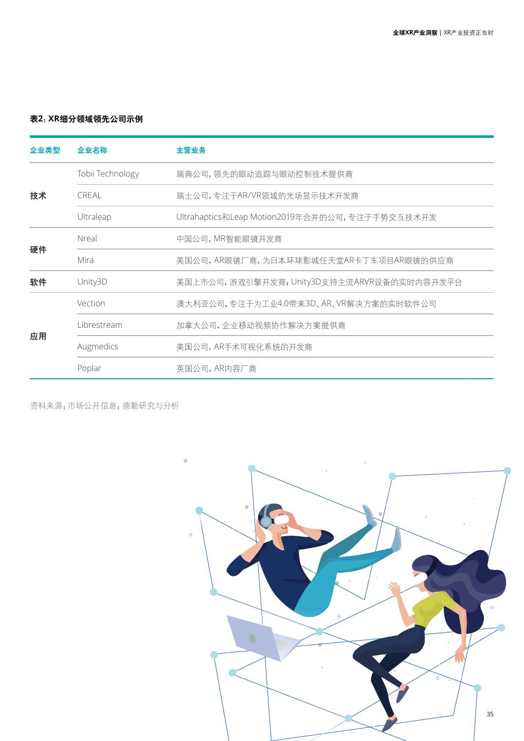 29 . 全球XR产业洞察 | XR产业生态日渐丰满 XR生态趋于完善 • 内容应用厂商:C端主要为各大影视平 经历了早期的技术研发与突破、资本入 在市场蓬勃发展中,XR已经逐渐构建出由 台、游戏公司、社交媒体,B端主要为教 场、轻量化硬件出产、初步用户群体产生 计算平台、硬件供应商、内容应用厂商和 育机构、医疗机构、广告公司等; 等重要阶段,XR产业现在已经由过去的硬 用户等多方参与者构成的完善的生态体 件厂商、应用开发商等少数公司单打独斗 • 用户:为XR设备、内容应用买单的C端消 系,移动运营商、云服务供应商、网络服务 发展成为了多方共建的生态合作模式,参 费者和B端企业级用户; 供应商等基础设施供应商也是生态良性 与方共同努力共筑蓬勃发展的生态环境, 发展的重要根基。 • 生态合作伙伴:主要包括提供5G网络 生态各方正在加速融合创新。 产品或解决方案的移动运营商,提供云 • 计算平台:苹果、谷歌、索尼等拥有一定 服务的云厂商,提供AI、物联网等技术 产业基础的巨头公司; 支持的科技公司等。 • 设备厂商:包括芯片、传感器等核心器 件、感知交互、终端设备及设备外设为 主的独立厂商和OEM厂商; Open sans Open sans 图19:XR产业生态 技术积累 颠覆性 通常由企业用户率先推动 优质体验、合理价格 用户养成 硬件产品 操作系统 丰富的 推进内容、应用标准化 由硬件及内容厂商共同推动 及平台 内容应用 资料来源:德勤研究与分析 29
