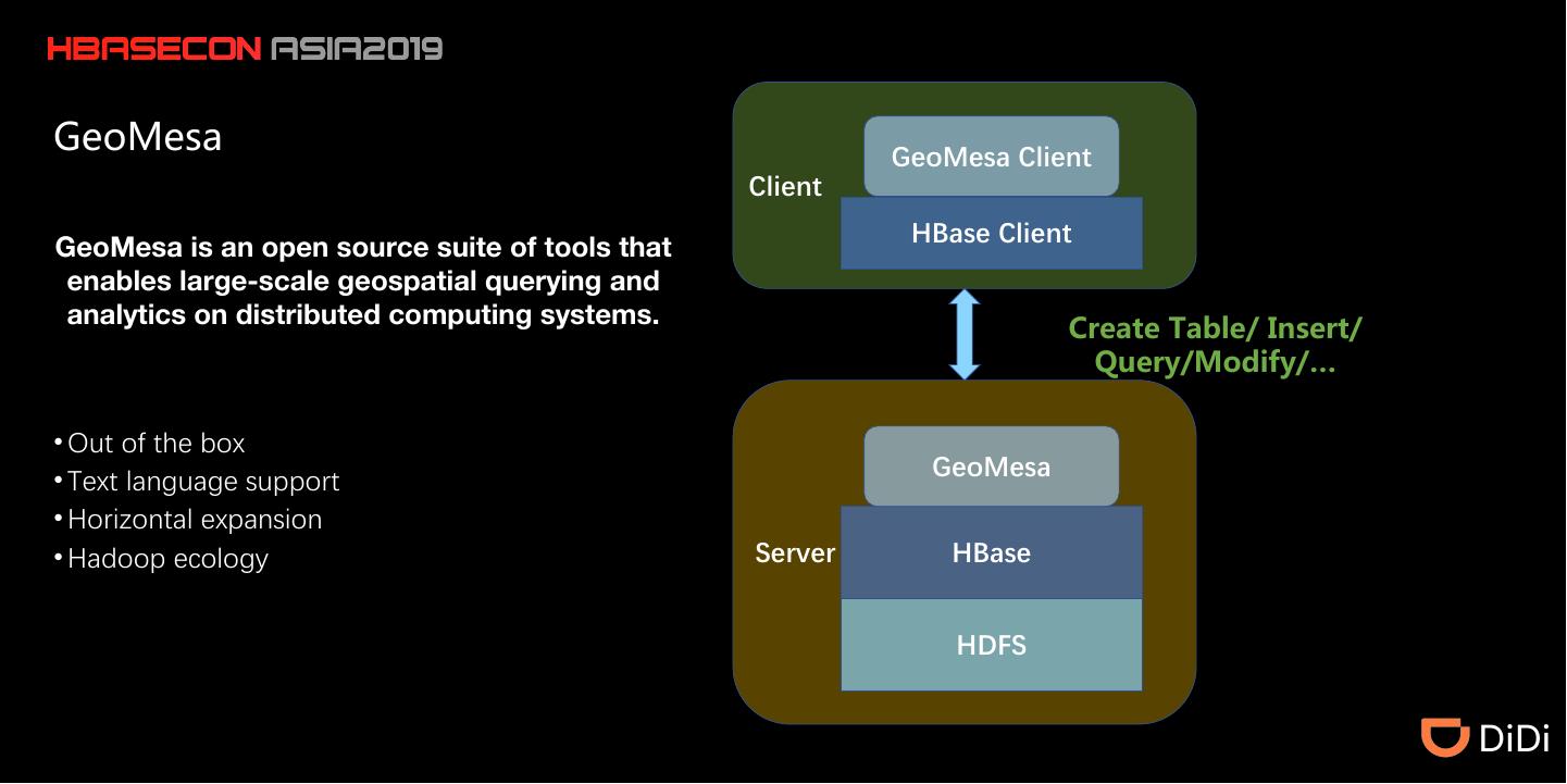 12 .GeoMesa GeoMesa Client Client HBase Client GeoMesa is an open source suite of tools that enables large-scale geospatial querying and analytics on distributed computing systems. Create Table/ Insert/ Query/Modify/… • Out of the box GeoMesa • Text language support • Horizontal expansion • Hadoop ecology Server HBase HDFS
