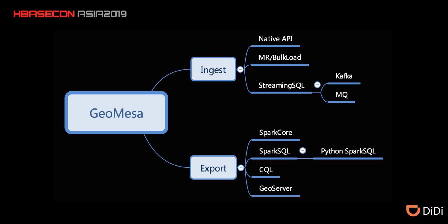 GeoMesa 系统提供导入和导出接口,导入接口支持 Native API,MR/BulkLoad,StreamingSQL,导出接口支持 SparkCore,SparkSQL,CQL,GeoServer.这样使用 GeoMesa 可以有以下好处: