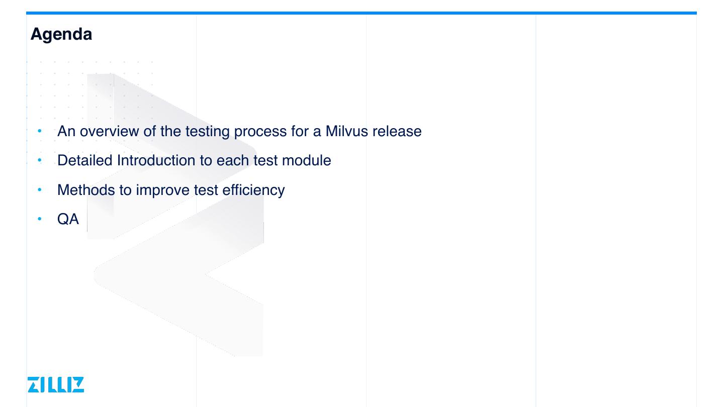 3 .Agenda • An overview of the testing process for a Milvus release • Detailed Introduction to each test module • Methods to improve test efficiency • QA