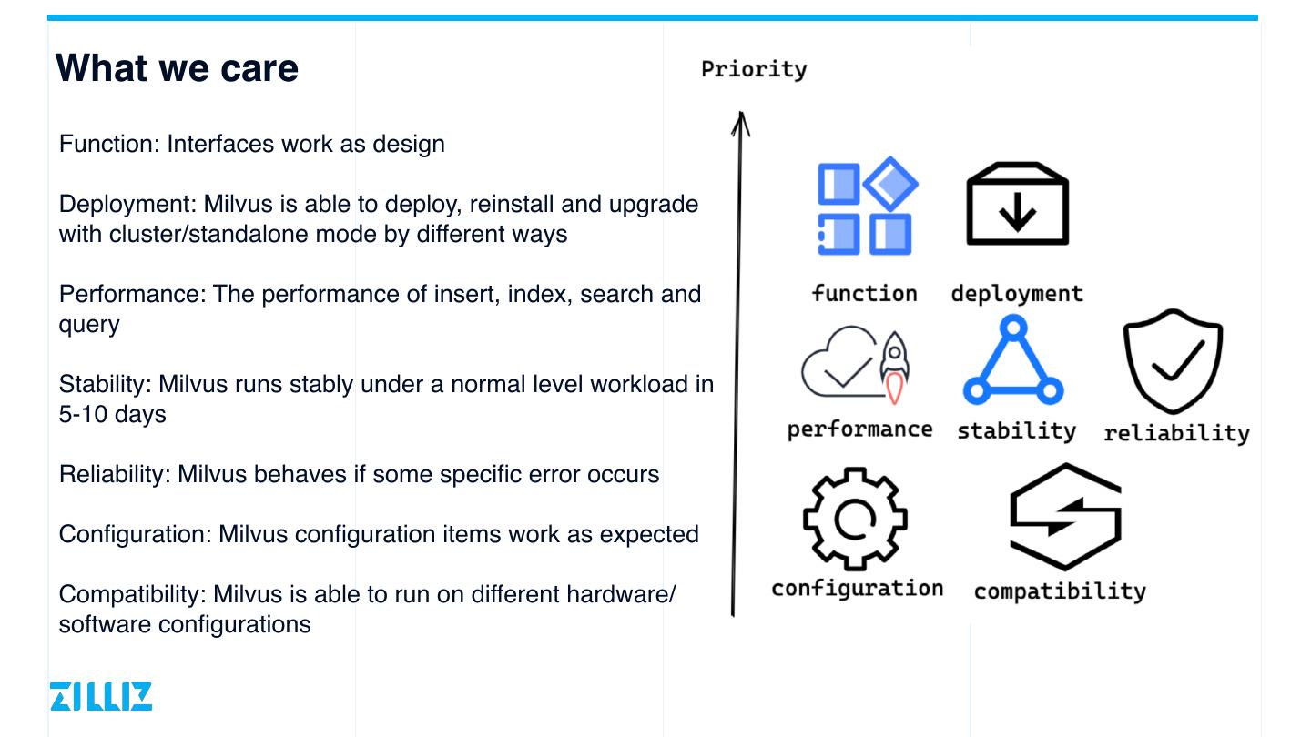 6 .What we care Function: Interfaces work as design Deployment: Milvus is able to deploy, reinstall and upgrade with cluster/standalone mode by different ways Performance: The performance of insert, index, search and query Stability: Milvus runs stably under a normal level workload in 5-10 days Reliability: Milvus behaves if some specific error occurs Configuration: Milvus configuration items work as expected Compatibility: Milvus is able to run on different hardware/ software configurations