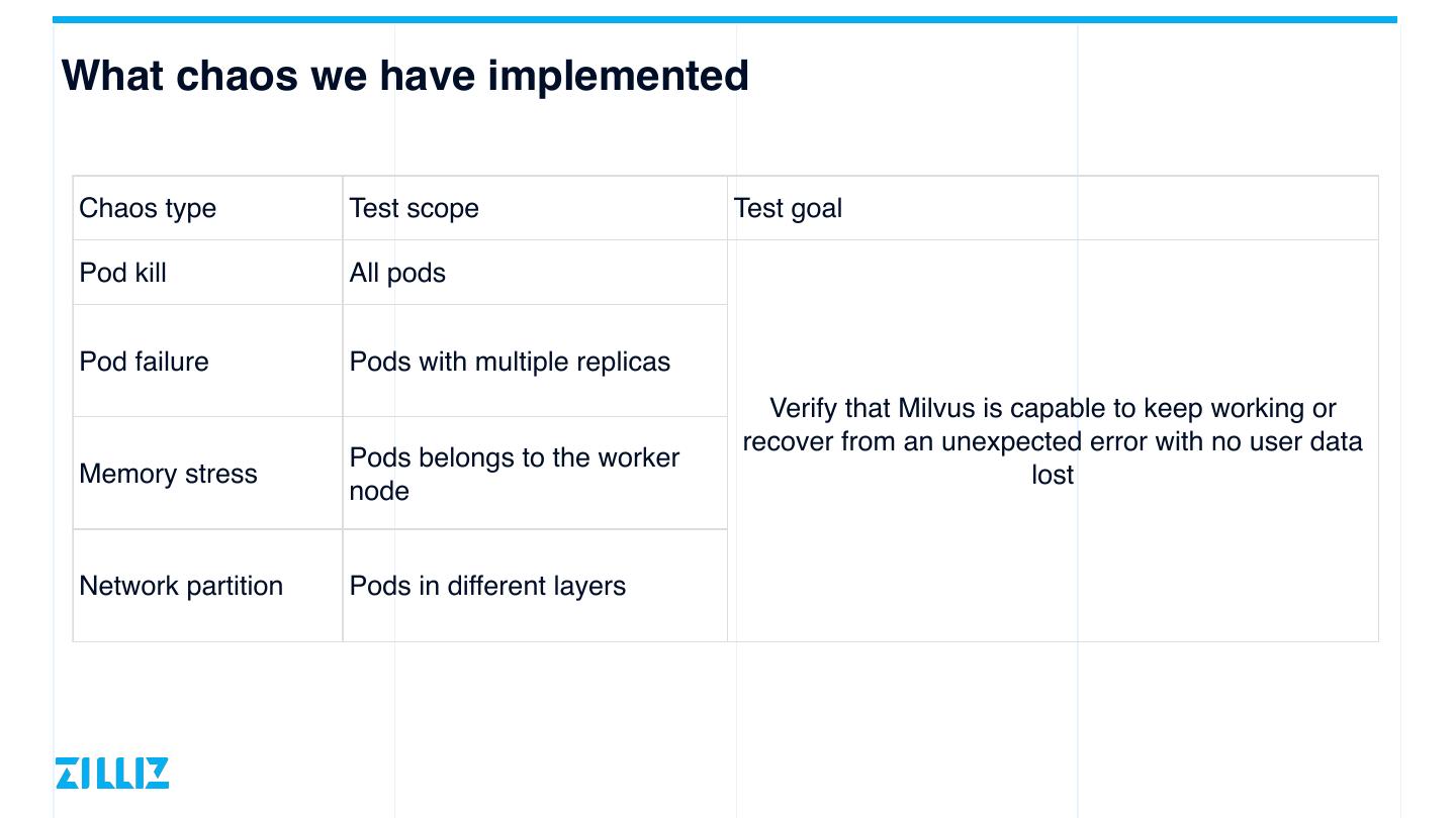 22 .What chaos we have implemented Chaos type Test scope Test goal Pod kill All pods Pod failure Pods with multiple replicas Verify that Milvus is capable to keep working or recover from an unexpected error with no user data Pods belongs to the worker Memory stress lost node Network partition Pods in different layers