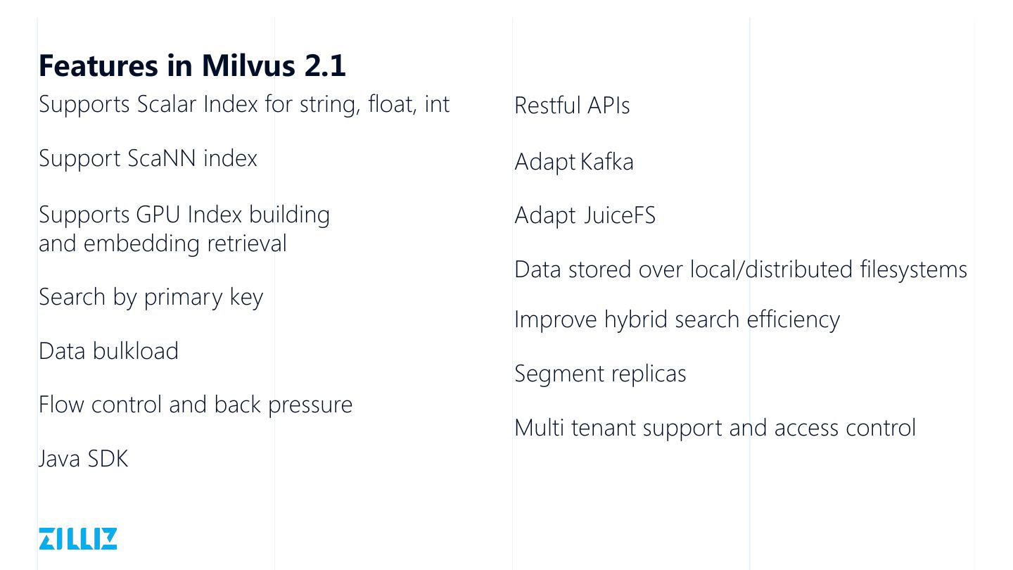 20 .Features in Milvus 2.2 Long Term search/query result pagination static data encryption Primary key deduplication FPGA and other Heterogeneous hardware On-disk vector indexing Automatic index optimization Embedded Milvus that runs on laptops Dynamic cluster expansion/shrink Integrates distributed KV stores (HBase/TiKV/FoundationDB) SQL-like Query Language