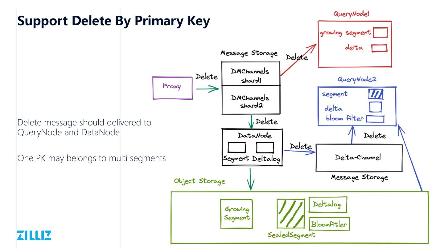 28 .Support Delete By Primary Key Delete message should delivered to QueryNode and DataNode One PK may belongs to multi segments