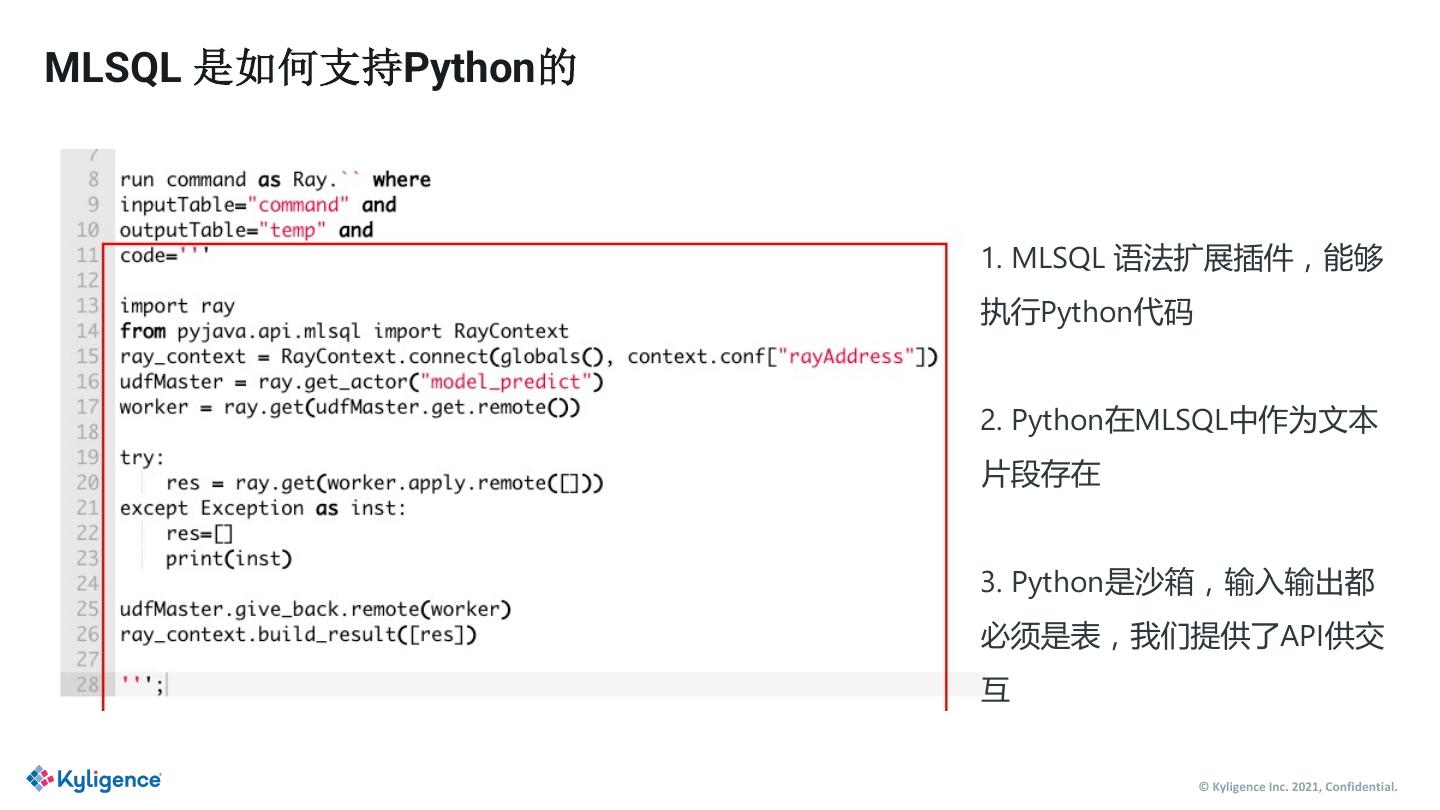 3 .MLSQL 是如何支持Python的 1. MLSQL 语法扩展插件,能够 执行Python代码 2. Python在MLSQL中作为文本 片段存在 3. Python是沙箱,输入输出都 必须是表,我们提供了API供交 互 © Kyligence Inc. 2021, Confidential.