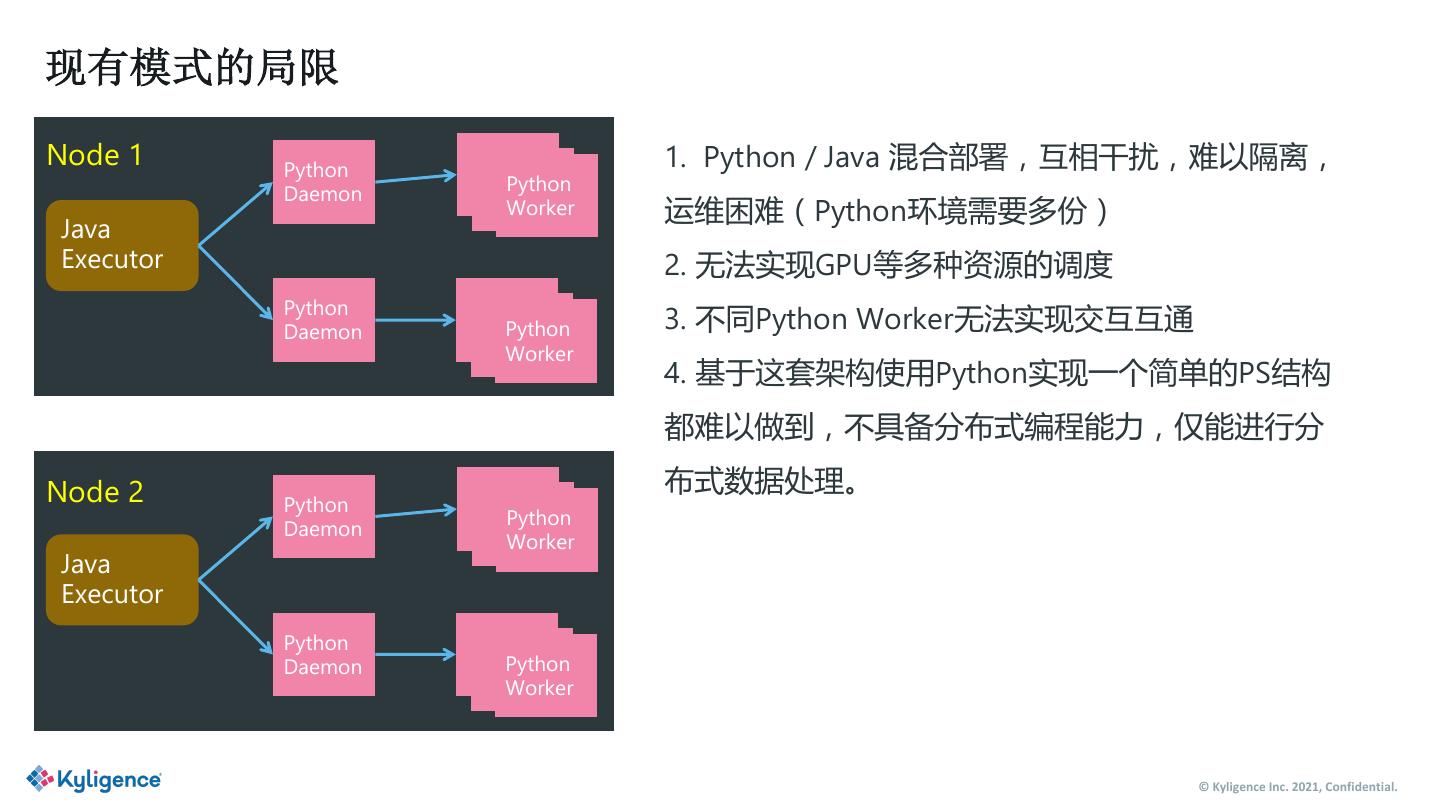5 .现有模式的局限 Node 1 Python 1. Python / Java 混合部署,互相干扰,难以隔离, Daemon Python Worker 运维困难(Python环境需要多份) Java Executor 2. 无法实现GPU等多种资源的调度 Python Daemon Python 3. 不同Python Worker无法实现交互互通 Worker 4. 基于这套架构使用Python实现一个简单的PS结构 都难以做到,不具备分布式编程能力,仅能进行分 Node 2 布式数据处理。 Python Daemon Python Worker Java Executor Python Daemon Python Worker © Kyligence Inc. 2021, Confidential.