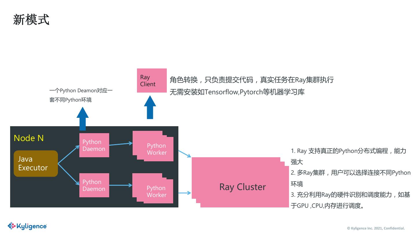 7 .新模式 Ray 角色转换,只负责提交代码,真实任务在Ray集群执行 Client 一个Python Deamon对应一 无需安装如Tensorflow,Pytorch等机器学习库 套不同Python环境 Node N Python Daemon Python Worker 1. Ray 支持真正的Python分布式编程,能力 Java 强大 Executor 2. 多Ray集群,用户可以选择连接不同Python Python 环境 Daemon Python Ray Cluster Worker 3. 充分利用Ray的硬件识别和调度能力,如基 于GPU ,CPU,内存进行调度。 © Kyligence Inc. 2021, Confidential.