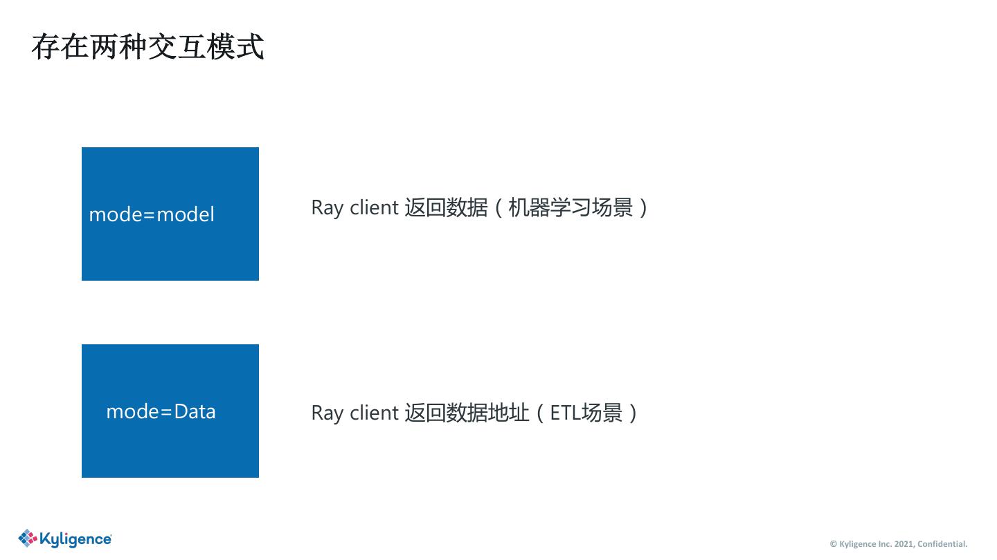8 .存在两种交互模式 mode=model Ray client 返回数据(机器学习场景) mode=Data Ray client 返回数据地址(ETL场景) © Kyligence Inc. 2021, Confidential.
