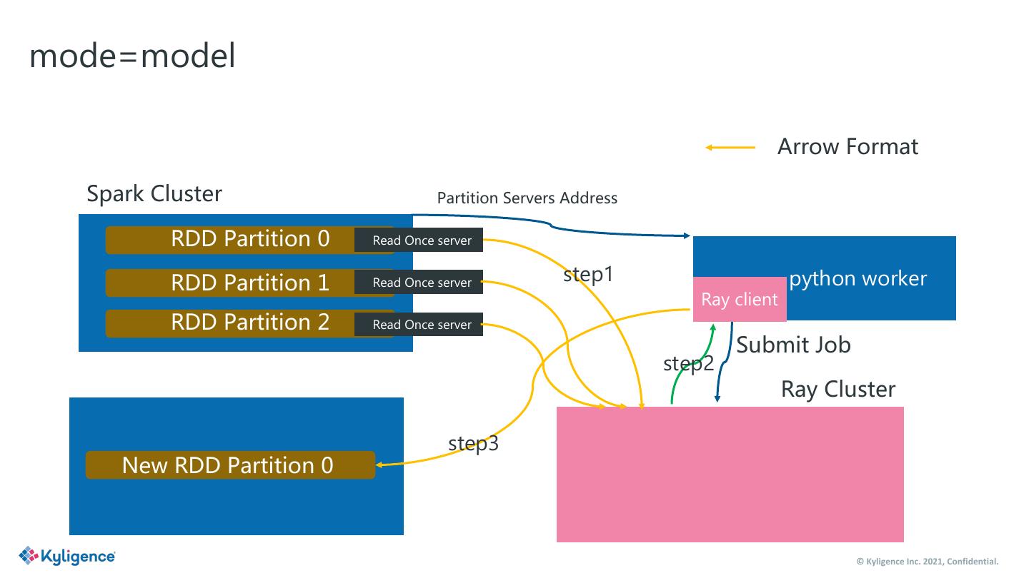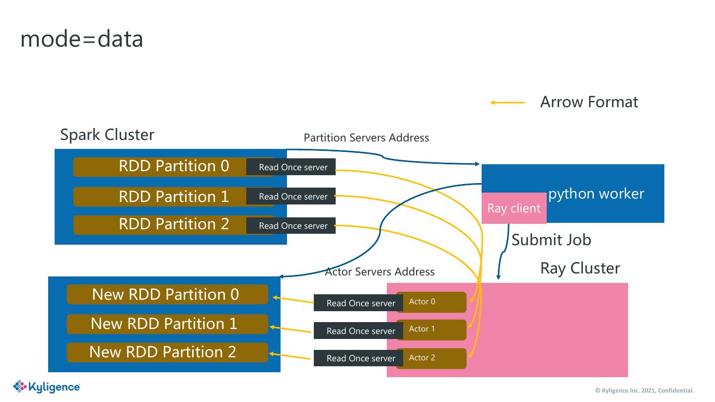 11 .mode=data Arrow Format Spark Cluster Partition Servers Address RDD Partition 0 Read Once server RDD Partition 1 Read Once server python worker Ray client RDD Partition 2 Read Once server Submit Job Actor Servers Address Ray Cluster New RDD Partition 0 Read Once server Actor 0 New RDD Partition 1 Read Once server Actor 1 New RDD Partition 2 Read Once server Actor 2 © Kyligence Inc. 2021, Confidential.