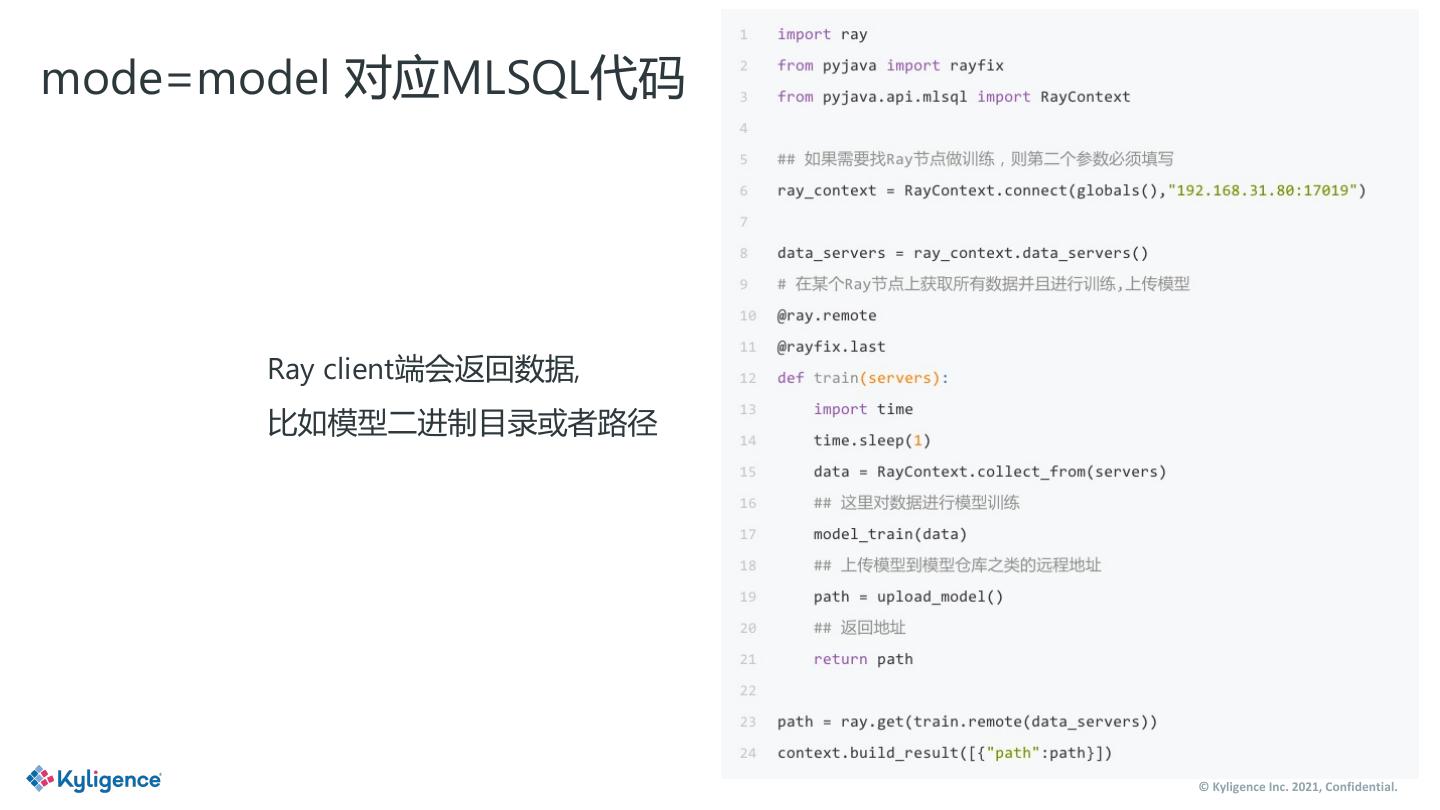 10 .mode=model 对应MLSQL代码 Ray client端会返回数据, 比如模型二进制目录或者路径 © Kyligence Inc. 2021, Confidential.