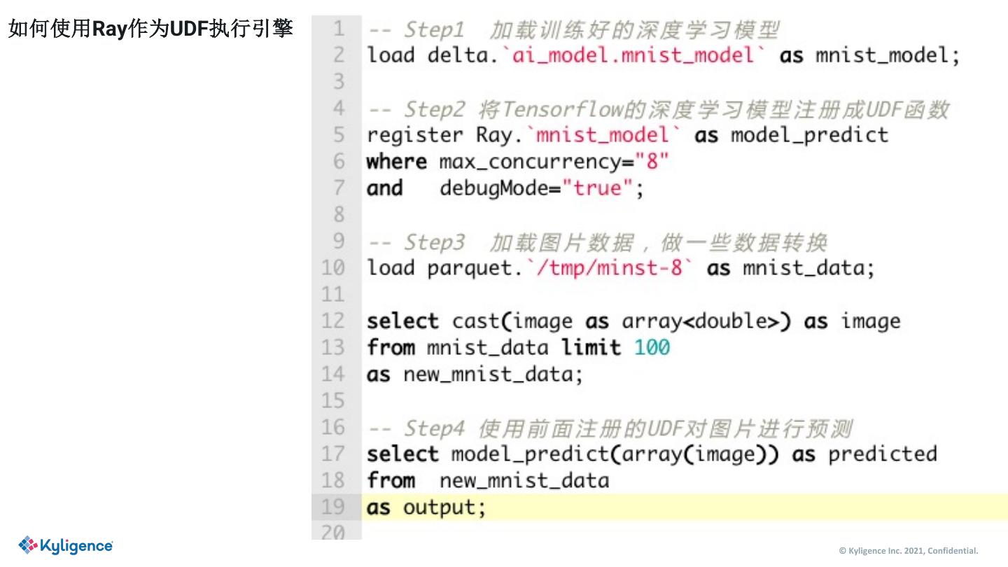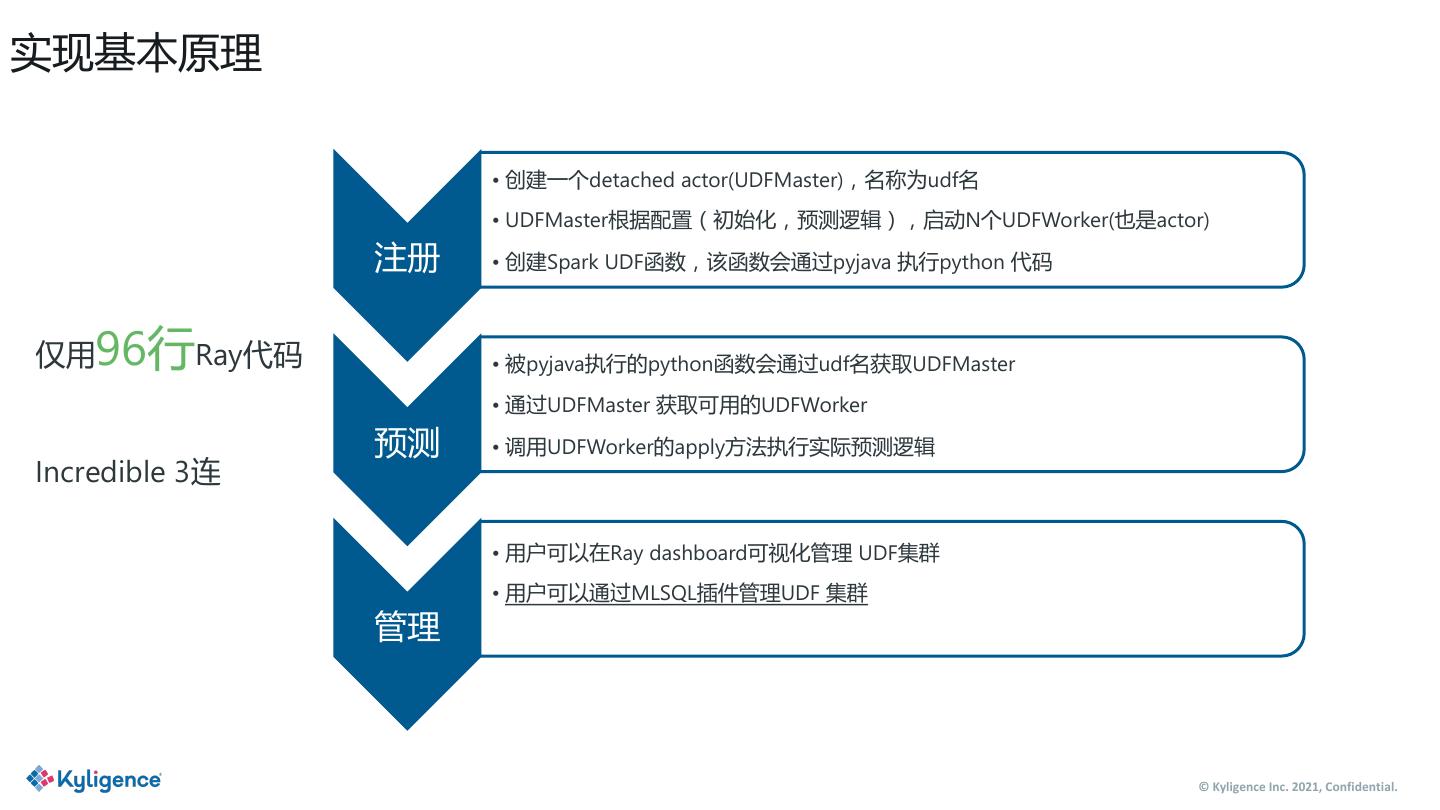 19 .实现基本原理 • 创建一个detached actor(UDFMaster),名称为udf名 • UDFMaster根据配置(初始化,预测逻辑),启动N个UDFWorker(也是actor) 注册 • 创建Spark UDF函数,该函数会通过pyjava 执行python 代码 仅用96行Ray代码 • 被pyjava执行的python函数会通过udf名获取UDFMaster • 通过UDFMaster 获取可用的UDFWorker 预测 • 调用UDFWorker的apply方法执行实际预测逻辑 Incredible 3连 • 用户可以在Ray dashboard可视化管理 UDF集群 • 用户可以通过MLSQL插件管理UDF 集群 管理 © Kyligence Inc. 2021, Confidential.