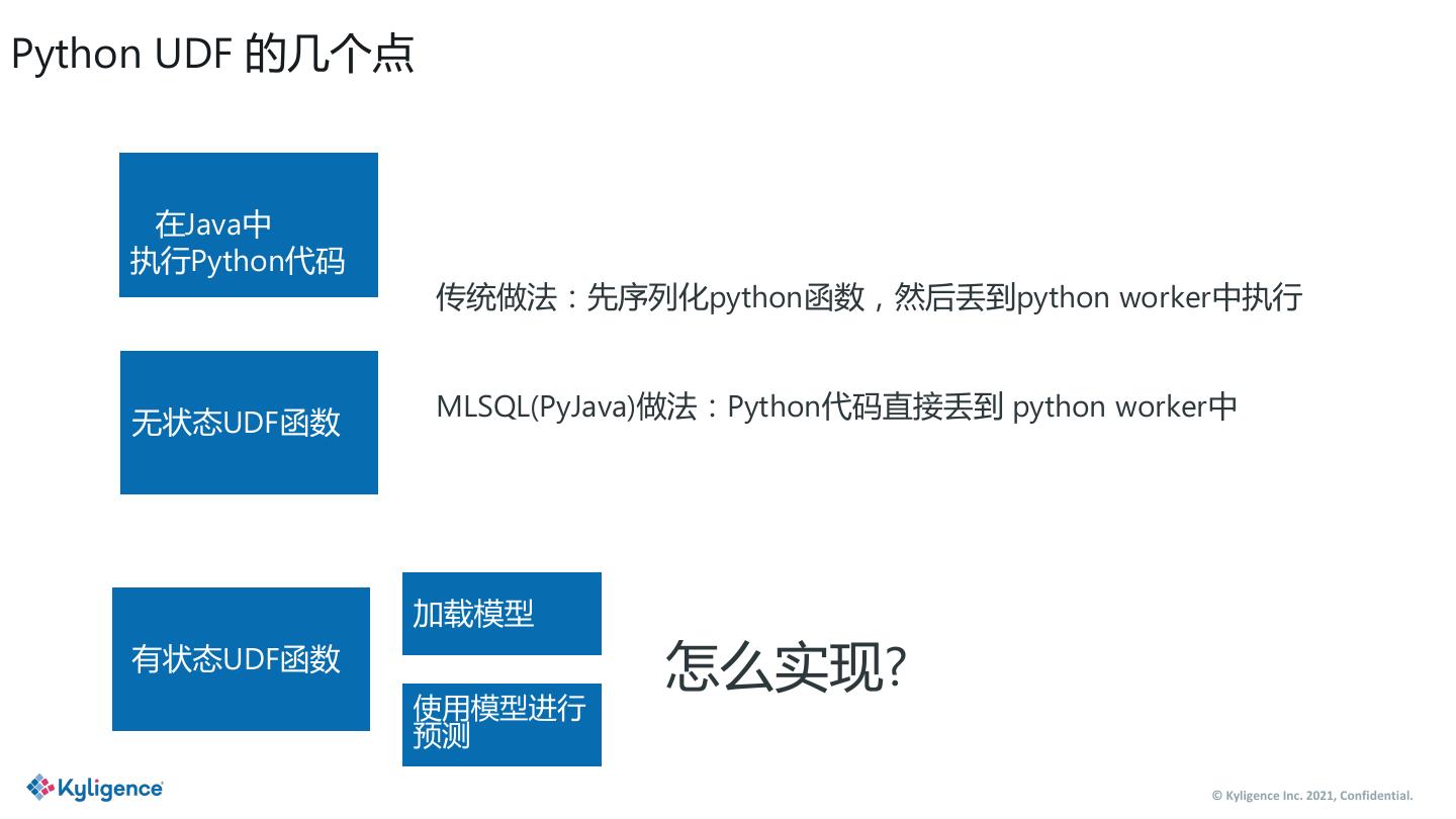 20 .用户可自定义注册和预测部分实现 提供模型加载以及预测代码 此时会根据这些信息启动UDF Cluster 使用Python预测代码创建 Spark UDF © Kyligence Inc. 2021, Confidential.