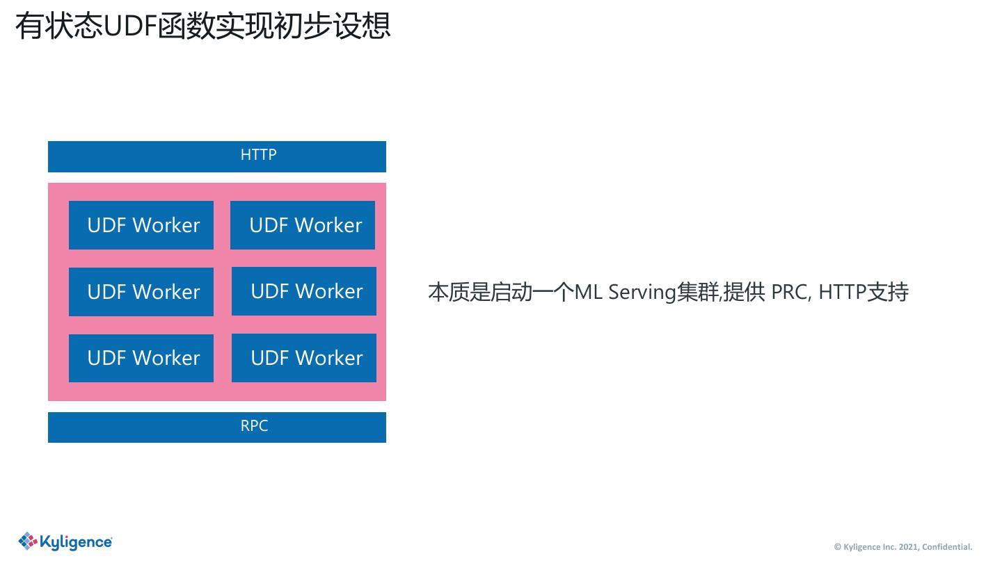 16 .有状态UDF函数实现初步设想 HTTP UDF Worker UDF Worker UDF Worker UDF Worker 本质是启动一个ML Serving集群,提供 PRC, HTTP支持 UDF Worker UDF Worker RPC © Kyligence Inc. 2021, Confidential.