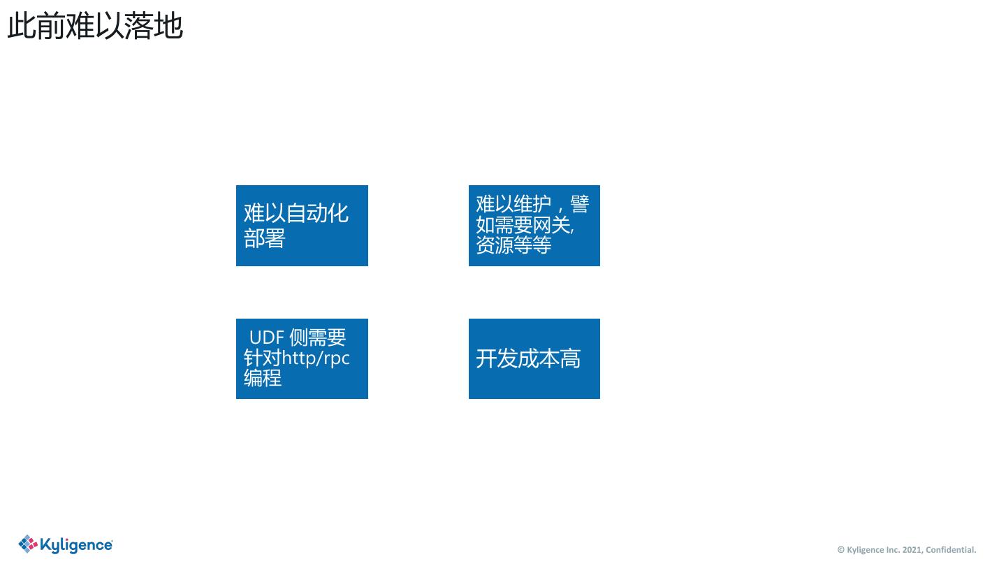 17 .此前难以落地 难以维护,譬 难以自动化 如需要网关, 部署 资源等等 UDF 侧需要 针对http/rpc 开发成本高 编程 © Kyligence Inc. 2021, Confidential.