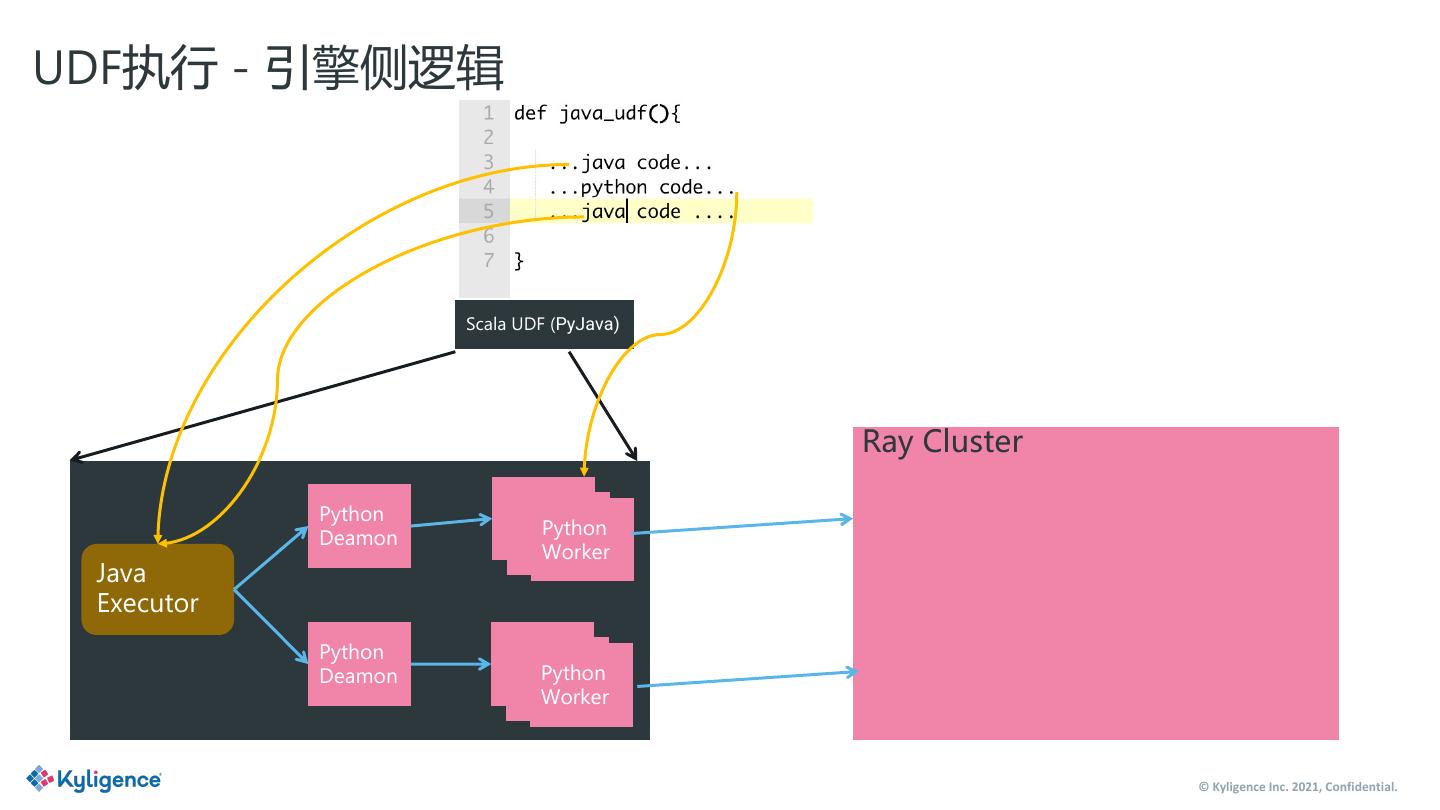22 .UDF执行 - 引擎侧逻辑 Scala UDF (PyJava) Ray Cluster Python Deamon Python Worker Java Executor Python Deamon Python Worker © Kyligence Inc. 2021, Confidential.