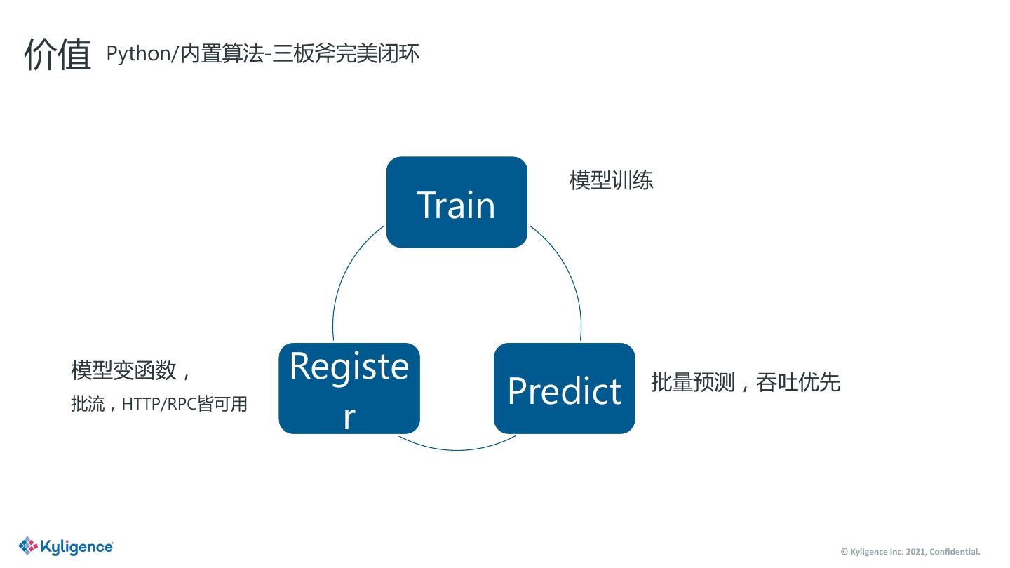 24 .价值 Python/内置算法-三板斧完美闭环 模型训练 Train 模型变函数, Registe Predict 批量预测,吞吐优先 r 批流,HTTP/RPC皆可用 © Kyligence Inc. 2021, Confidential.