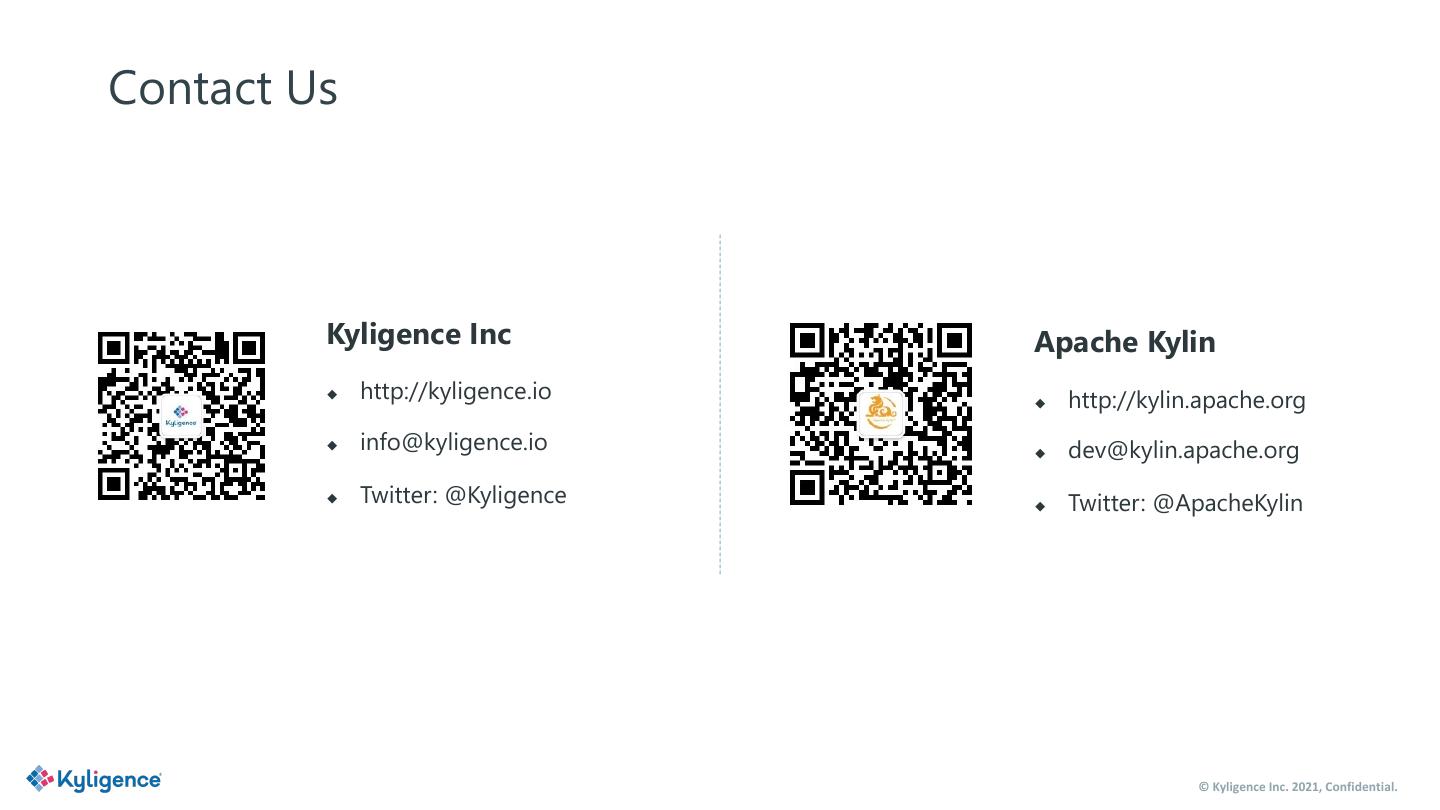 26 .Contact Us Kyligence Inc Apache Kylin u http://kyligence.io u http://kylin.apache.org u info@kyligence.io u dev@kylin.apache.org u Twitter: @Kyligence u Twitter: @ApacheKylin © Kyligence Inc. 2021, Confidential.