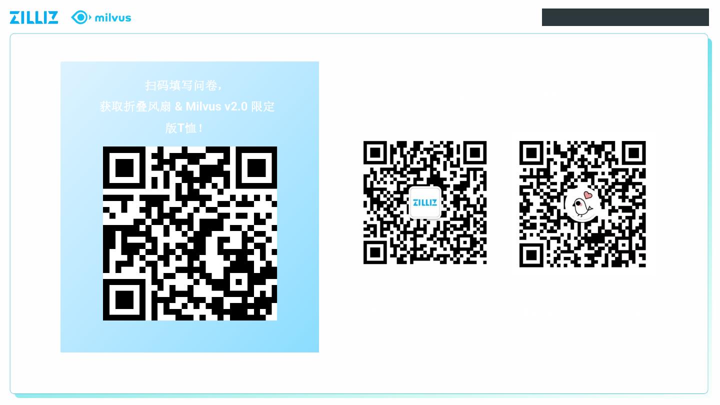 27 . 扫码填写问卷, 欢迎关注我们的社交媒体账号 获取折叠风扇 & Milvus v2.0 限定 版T恤! 微信公众号 微信视频号 (Milvus相关最新文章) (Milvus最新视频、直播)