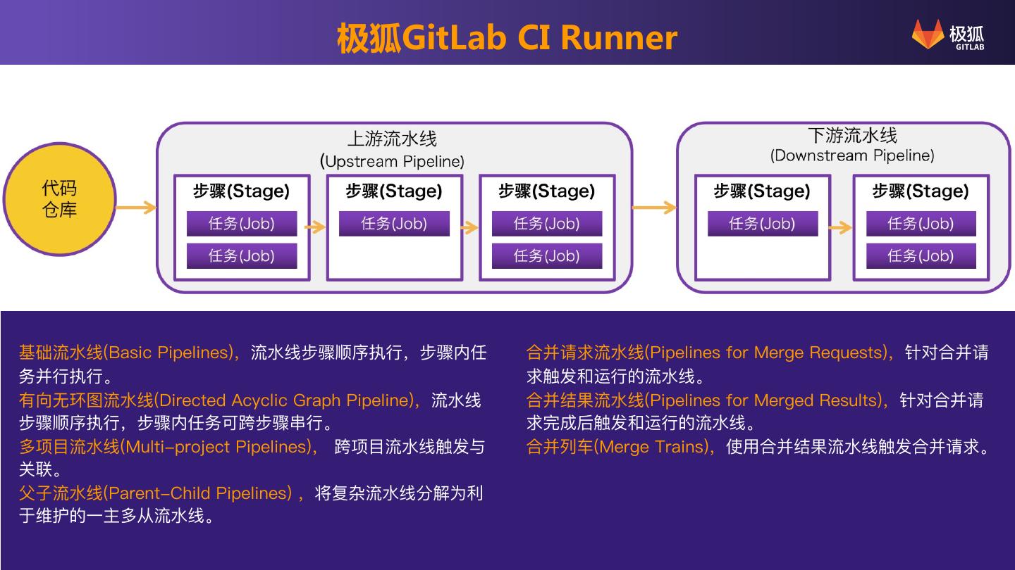 11 . 极狐GitLab CI Runner 基础流⽔线(Basic Pipelines),流⽔线步骤顺序执⾏,步骤内任 合并请求流⽔线(Pipelines for Merge Requests),针对合并请 务并⾏执⾏。 求触发和运⾏的流⽔线。 有向⽆环图流⽔线(Directed Acyclic Graph Pipeline),流⽔线 合并结果流⽔线(Pipelines for Merged Results),针对合并请 步骤顺序执⾏,步骤内任务可跨步骤串⾏。 求完成后触发和运⾏的流⽔线。 多项⽬流⽔线(Multi-project Pipelines), 跨项⽬流⽔线触发与 合并列⻋(Merge Trains),使⽤合并结果流⽔线触发合并请求。 关联。 ⽗⼦流⽔线(Parent-Child Pipelines) ,将复杂流⽔线分解为利 于维护的⼀主多从流⽔线。