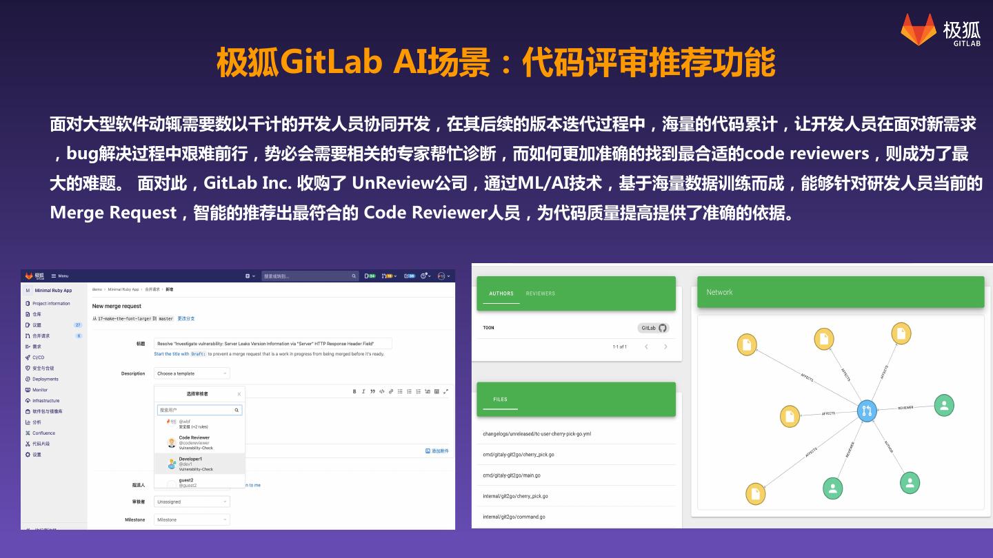 14 . 极狐GitLab AI场景:代码评审推荐功能 面对大型软件动辄需要数以千计的开发人员协同开发,在其后续的版本迭代过程中,海量的代码累计,让开发人员在面对新需求 ,bug解决过程中艰难前行,势必会需要相关的专家帮忙诊断,而如何更加准确的找到最合适的code reviewers,则成为了最 大的难题。 面对此,GitLab Inc. 收购了 UnReview公司,通过ML/AI技术,基于海量数据训练而成,能够针对研发人员当前的 Merge Request,智能的推荐出最符合的 Code Reviewer人员,为代码质量提高提供了准确的依据。
