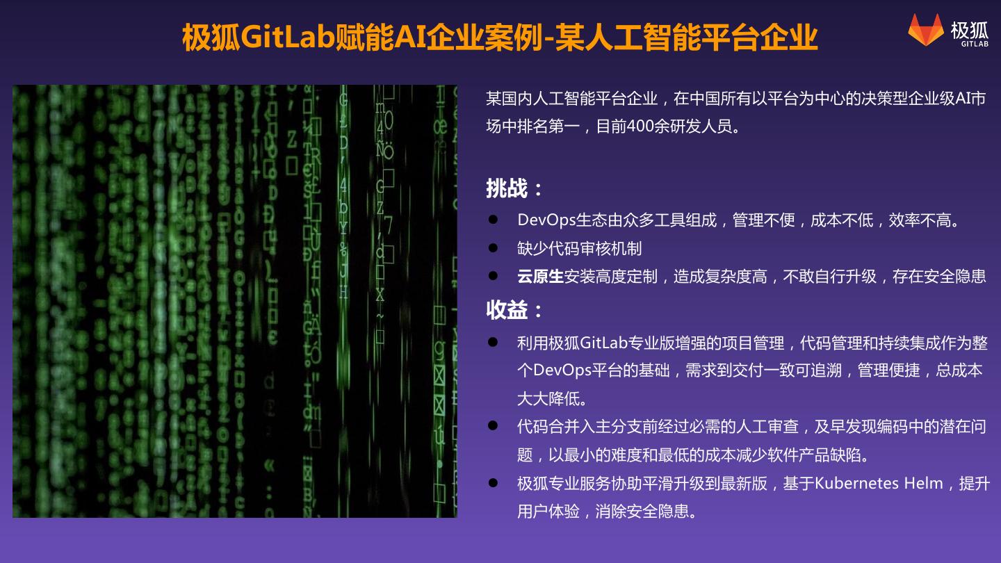 17 .极狐GitLab赋能AI企业案例-某人工智能平台企业 某国内人工智能平台企业,在中国所有以平台为中心的决策型企业级AI市 场中排名第一,目前400余研发人员。 挑战: ● DevOps生态由众多工具组成,管理不便,成本不低,效率不高。 ● 缺少代码审核机制 ● 云原生安装高度定制,造成复杂度高,不敢自行升级,存在安全隐患 收益: ● 利用极狐GitLab专业版增强的项目管理,代码管理和持续集成作为整 个DevOps平台的基础,需求到交付一致可追溯,管理便捷,总成本 大大降低。 ● 代码合并入主分支前经过必需的人工审查,及早发现编码中的潜在问 题,以最小的难度和最低的成本减少软件产品缺陷。 ● 极狐专业服务协助平滑升级到最新版,基于Kubernetes Helm,提升 用户体验,消除安全隐患。
