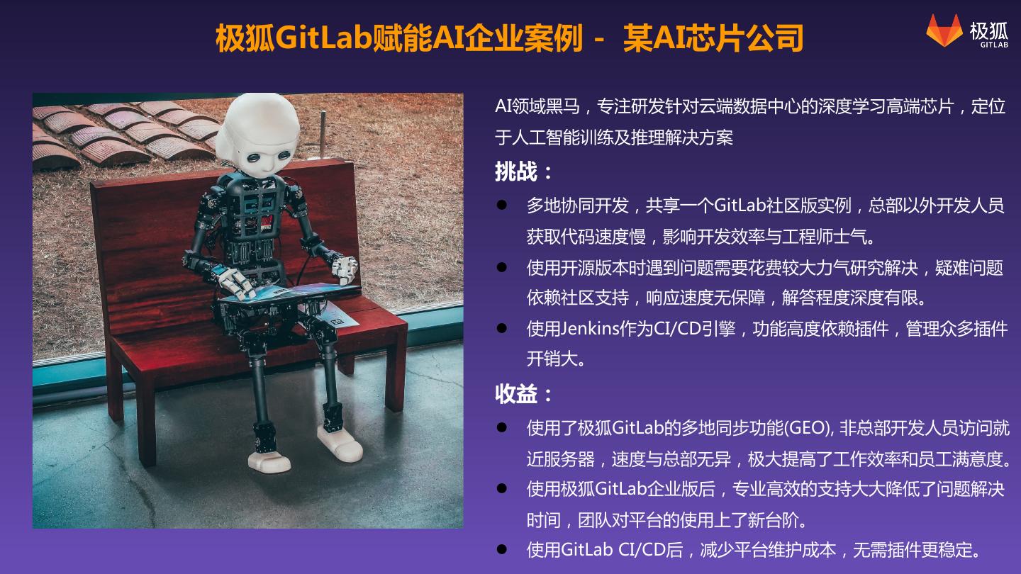 18 .极狐GitLab赋能AI企业案例 - 某AI芯片公司 AI领域黑马,专注研发针对云端数据中心的深度学习高端芯片,定位 于人工智能训练及推理解决方案 挑战: ● 多地协同开发,共享一个GitLab社区版实例,总部以外开发人员 获取代码速度慢,影响开发效率与工程师士气。 ● 使用开源版本时遇到问题需要花费较大力气研究解决,疑难问题 依赖社区支持,响应速度无保障,解答程度深度有限。 ● 使用Jenkins作为CI/CD引擎,功能高度依赖插件,管理众多插件 开销大。 收益: ● 使用了极狐GitLab的多地同步功能(GEO), 非总部开发人员访问就 近服务器,速度与总部无异,极大提高了工作效率和员工满意度。 ● 使用极狐GitLab企业版后,专业高效的支持大大降低了问题解决 时间,团队对平台的使用上了新台阶。 ● 使用GitLab CI/CD后,减少平台维护成本,无需插件更稳定。