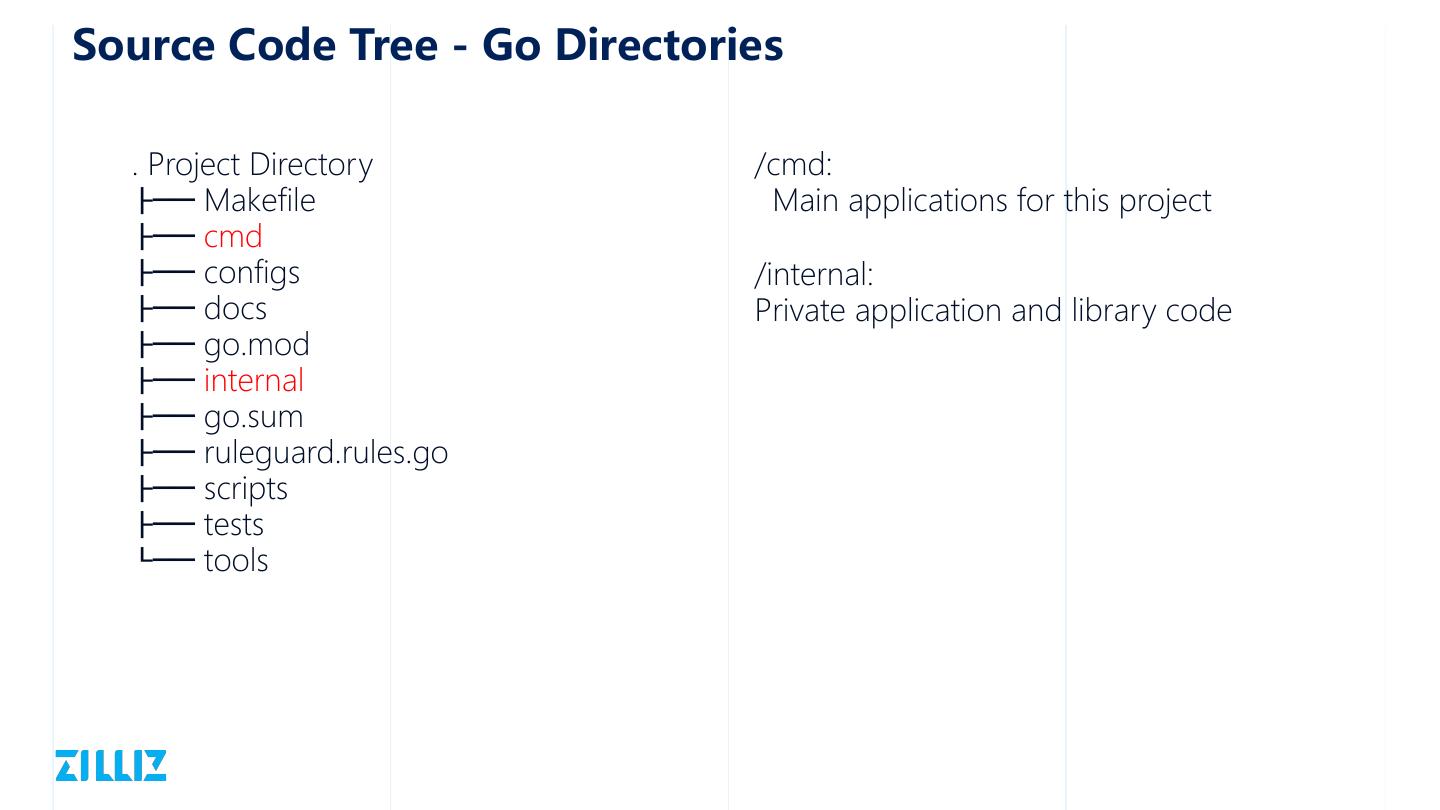12 .Source Code Tree - Go Directories . Project Directory /cmd: ├── Makefile Main applications for this project ├── cmd ├── configs /internal: ├── docs Private application and library code ├── go.mod ├── internal ├── go.sum ├── ruleguard.rules.go ├── scripts ├── tests └── tools