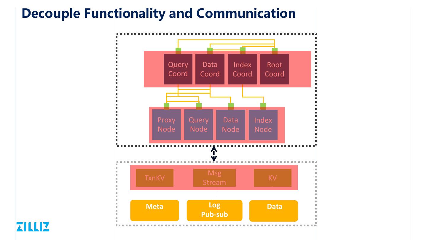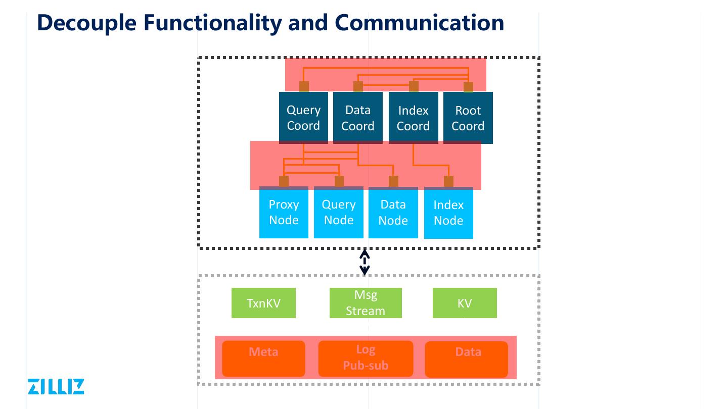 15 .Decouple Functionality and Communication Query Data Index Root Coord Coord Coord Coord Proxy Query Data Index Node Node Node Node Msg TxnKV KV Stream Meta Log Data Pub-sub