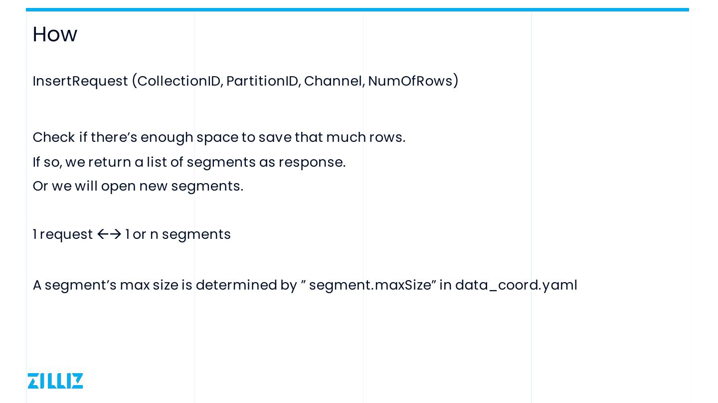 17 .How InsertRequest (CollectionID, PartitionID, Channel, NumOfRows) Check if there’s enough space to save that much rows. If so, we return a list of segments as response. Or we will open new segments. 1 request ßà 1 or n segments A segment’s max size is determined by ” segment.maxSize” in data_coord.yaml